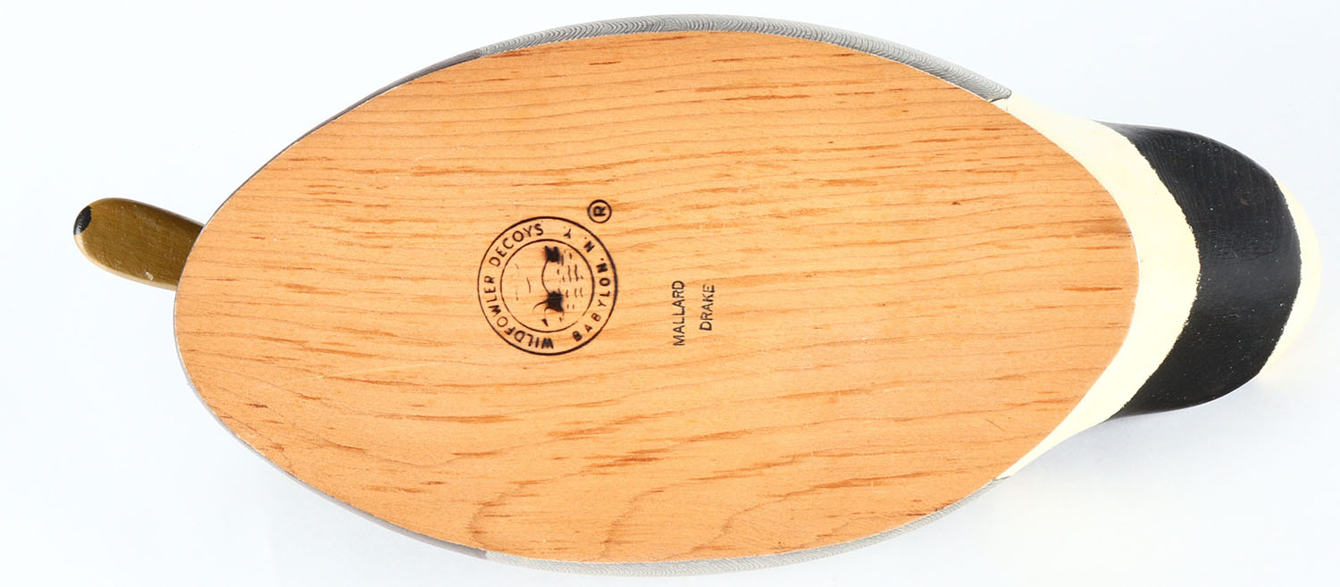Mallard Drake by Wildfowler Decoys Babylon NY, glass eyes, solid wood, original paint with comb painting, structurally excellent, branded by WILDFOWLER DECOYS on bottom. Grade: Excellent + - Value: 20 to 40