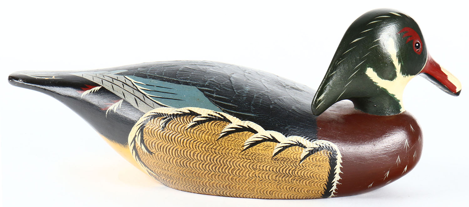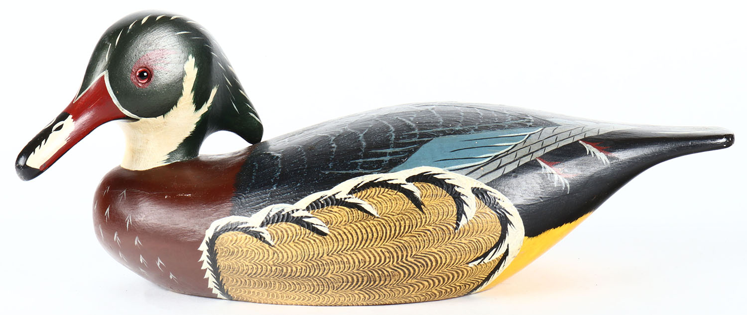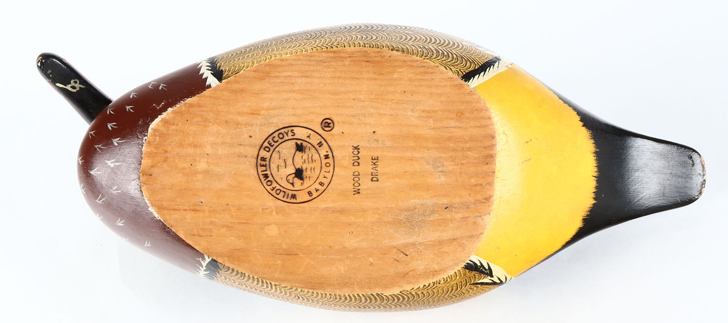 Woodduck Drake by Wildfowler Decoys Babylon NY, glass eyes, solid wood, original paint with Combing, WILDFOWLER DECOYS brand on bottom. Grade: Excellent - Value: 40 to 80