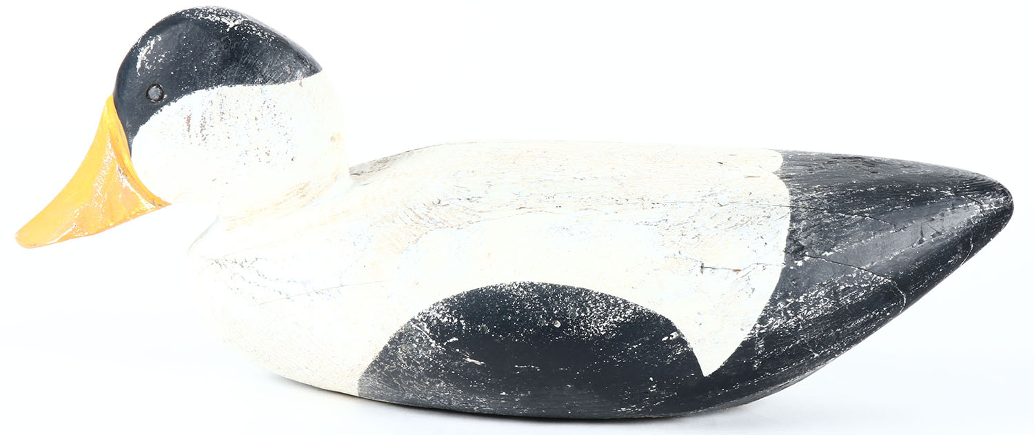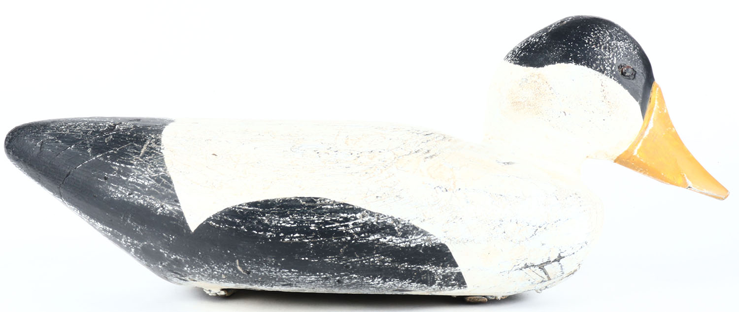 Eider by unknown maker with the initials J.G,, glass eyes, solid wood, repainted in style to appear vintage, has age cracks on back and bottom, ,maker initials on bottom. Grade: Very Good + - Value: 30 to 60