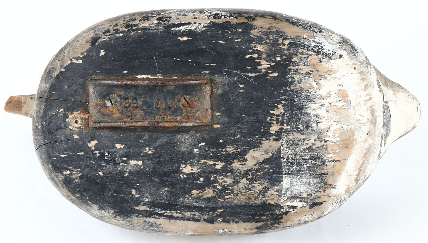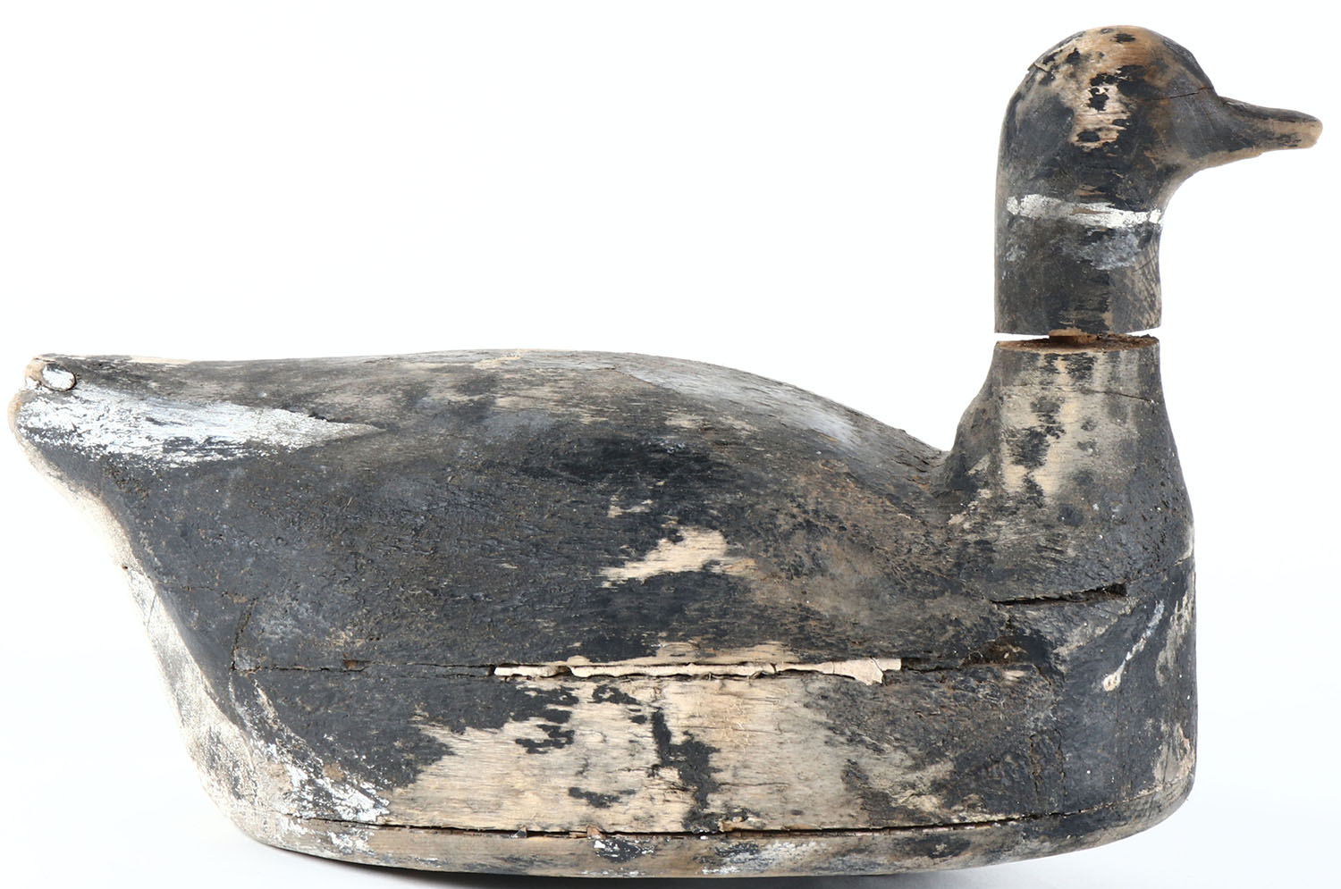 Black Brant by unknown maker, no eyes, solid wood, original paint, head is loose, has age cracks on entire body. Grade: Very Good - Value: 50 to 100