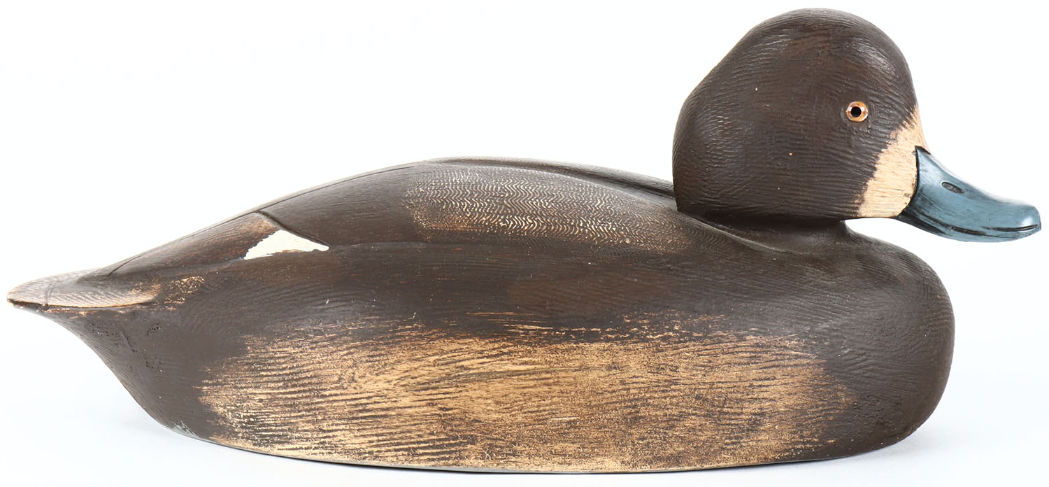 Bluebill Hen by Ontario, Canada maker - possibly Ken Anger, glass eyes, hollow wood, original paint, structurally excellent. Grade: Excellent - Value: 200 to 300