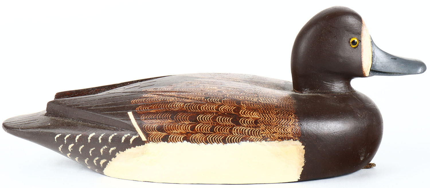 Bluebill Hen by Reg Bloom, Kingston, Ontario, glass eyes, solid wood, original paint with comb painting, structurally excellent. Grade: MINT - Value: 70 to 150