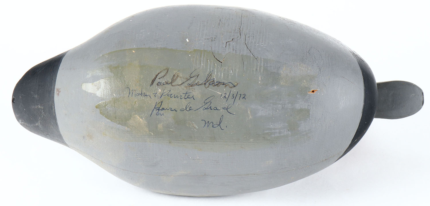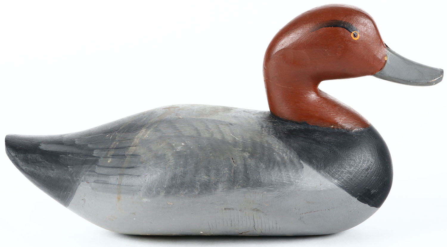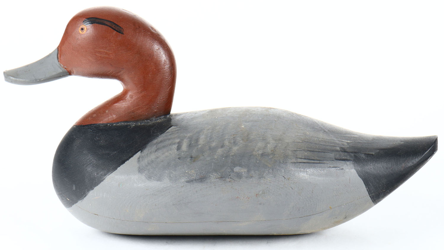 Redhead Drake by Paul Gibson, Havre de Grace, MD, painted eyes, solid wood, original paint, has age crack on bottom, Pauls signature protected by a coat of varnish, foreign material drips on right side. Grade: Very Good + - Value: 100 to 200