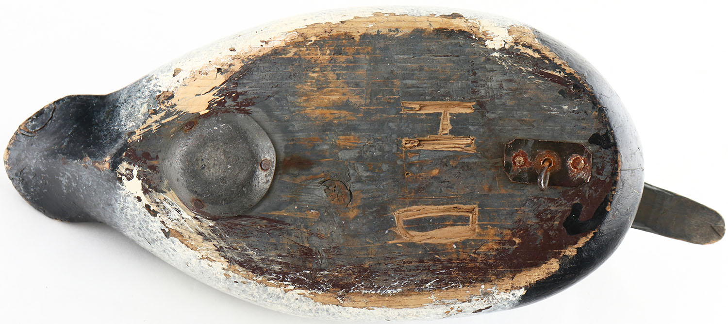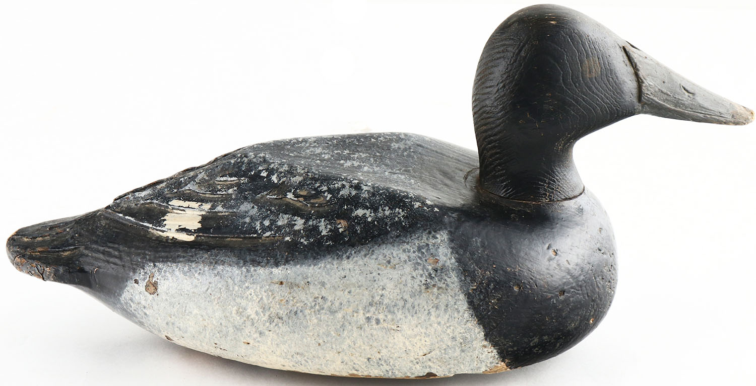 Canvasback Drake by unknown Wisconsin maker, painted eyes, solid wood, original paint, head is loose, has age cracks on back. Grade: Very Good - Value: 70 to 150