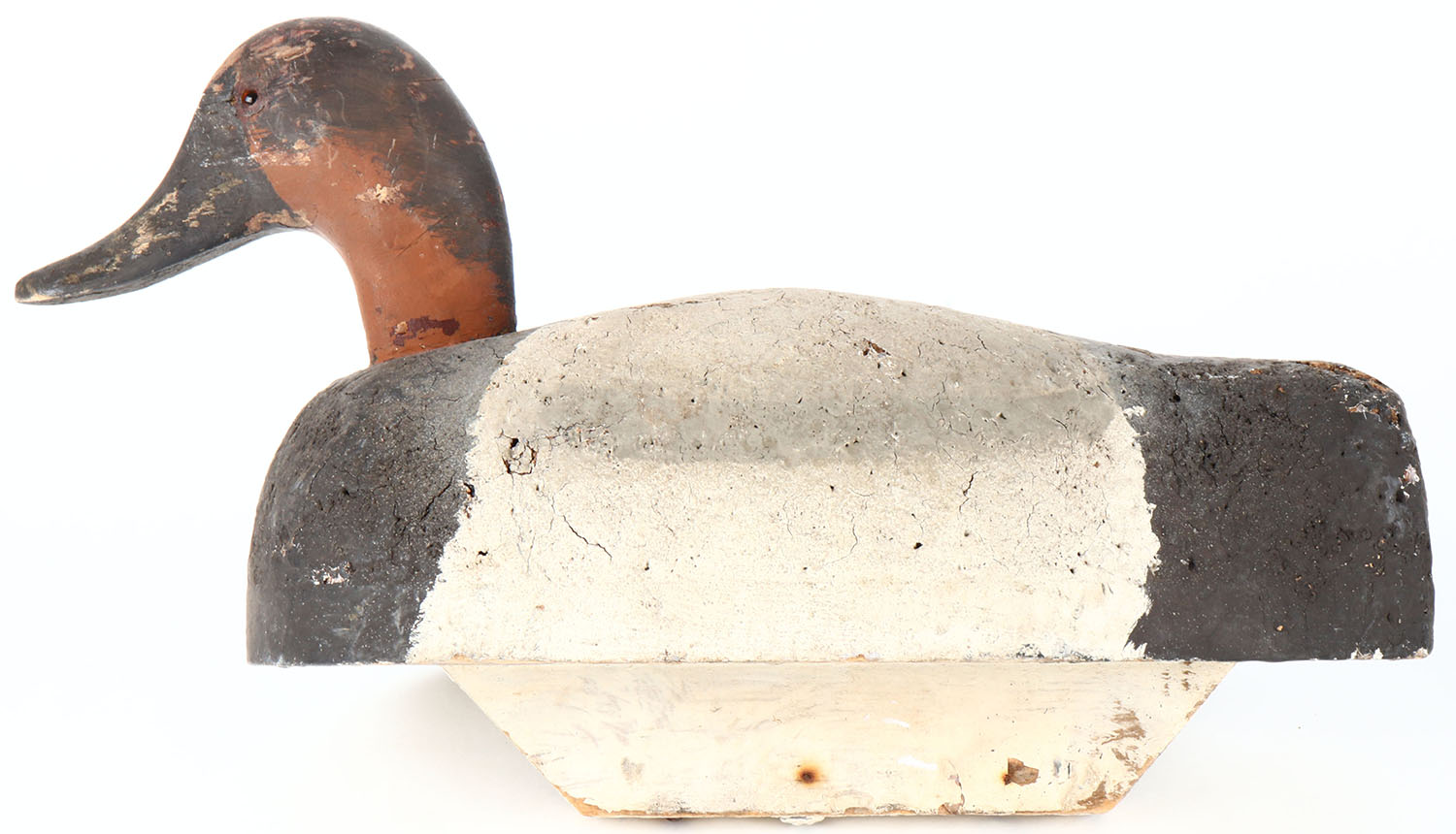 Canvasback Drake by unknown maker, glass eyes, hollow wood, combination of original paint and old hunter strengthening, has age cracks on entire body. Grade: Very Good - Value: 10 to 20