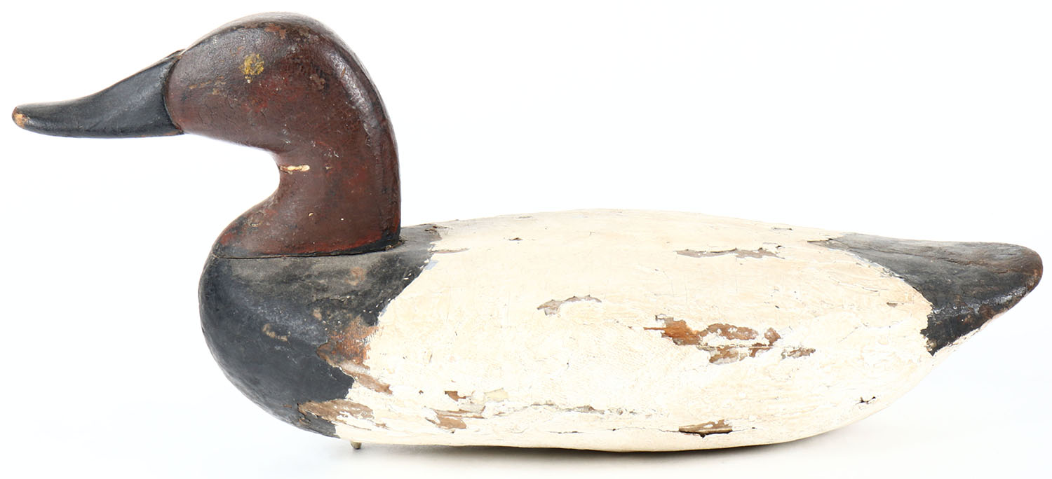 Canvasback Drake by unknown Maryland maker, painted eyes, solid wood, old hunter working repaint, has age cracks on back and bottom. Grade: Very Good - Value: 50 to 100