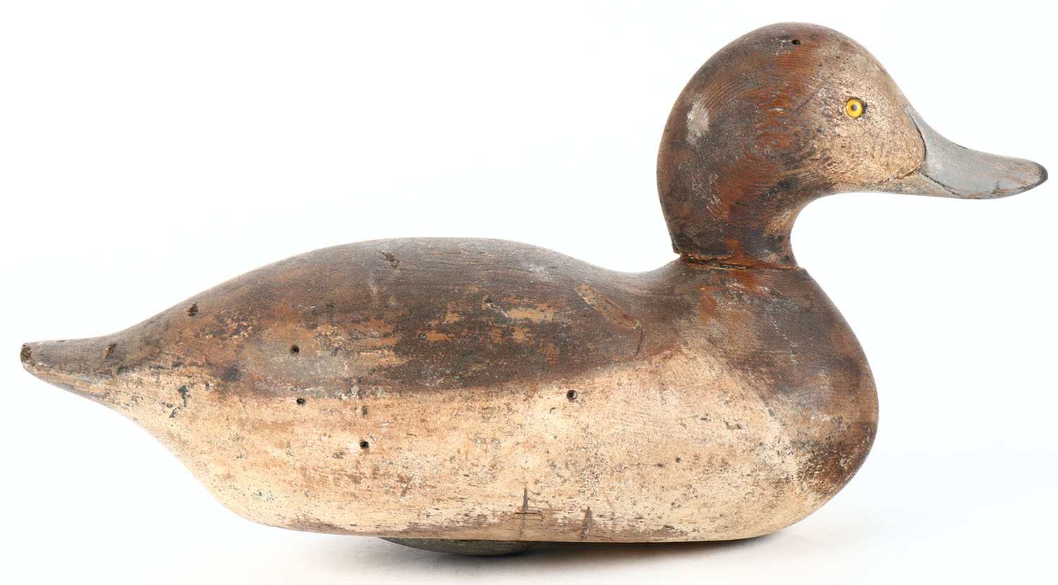 Challenge Bluebill Hen by Mason Decoy Company, Detroit, MI, 1896-1924. Glass eyes, solid wood, combination of old hunter strengthening with some original paint showing, has age cracks on bottom, tail is chipped. Grade: Very Good + - Value: 80 to 150