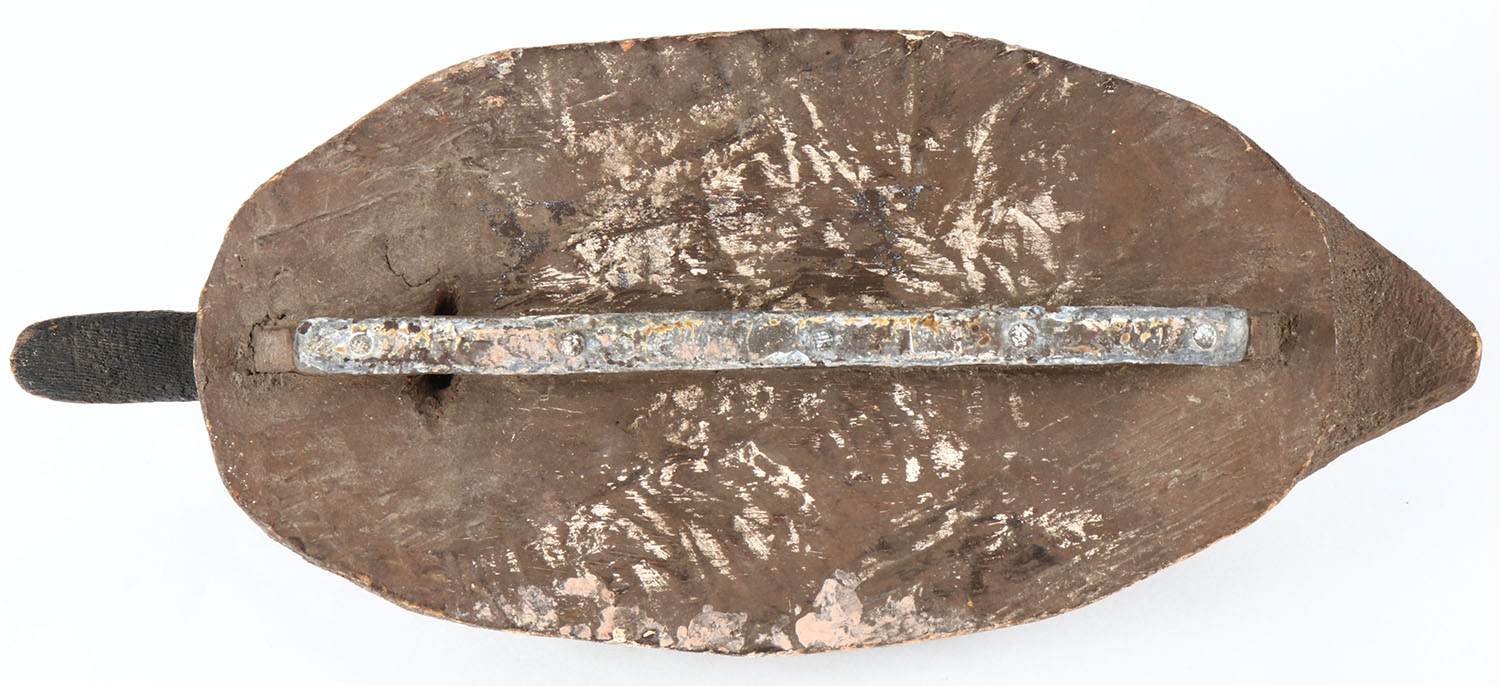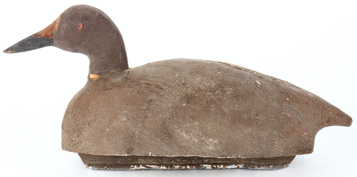 Canvasback Hen by unknown maker, tack eyes, solid wood, original paint, has age cracks on back, damage to the upper bill. Grade: Very Good + - Value: 20 to 40