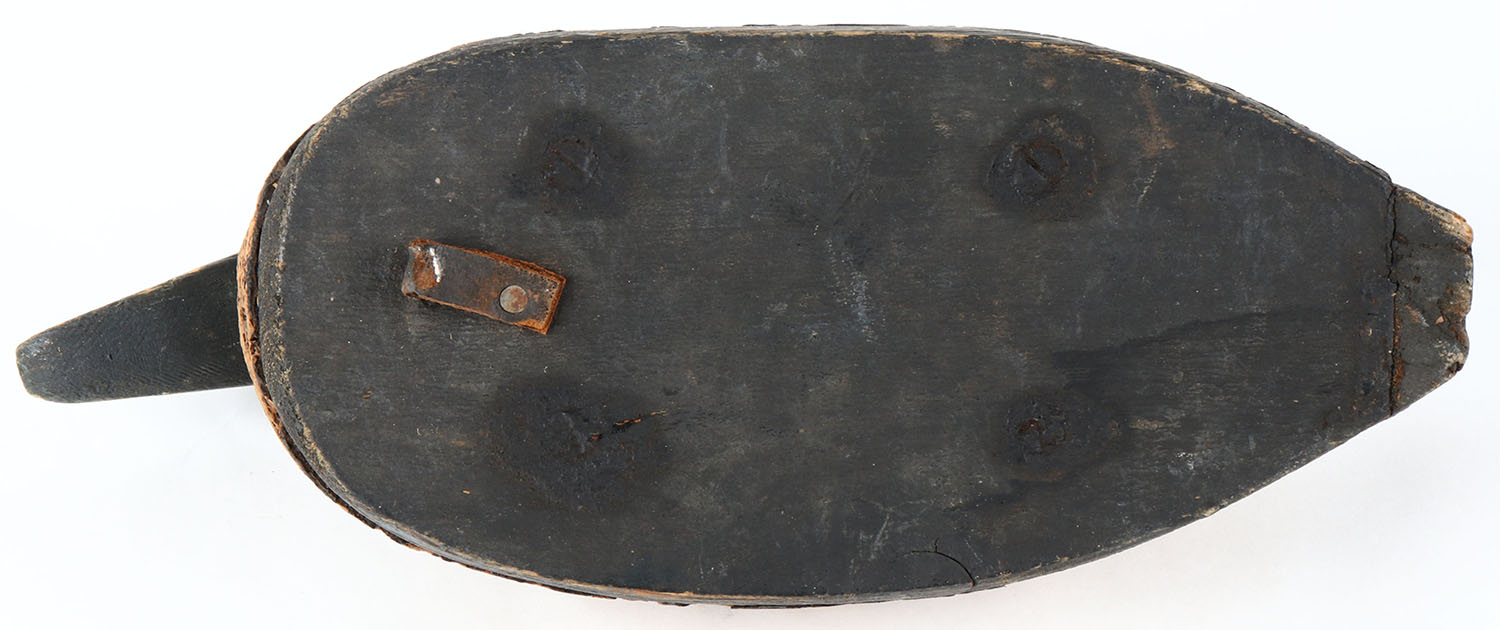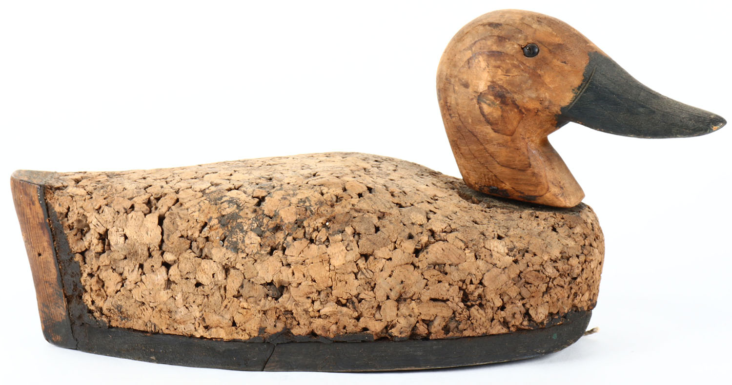 Canvasback Drake by unknown maker, glass eyes, solid cork body on wood base, head is loose. Grade: Very Good + - Value: 10 to 20