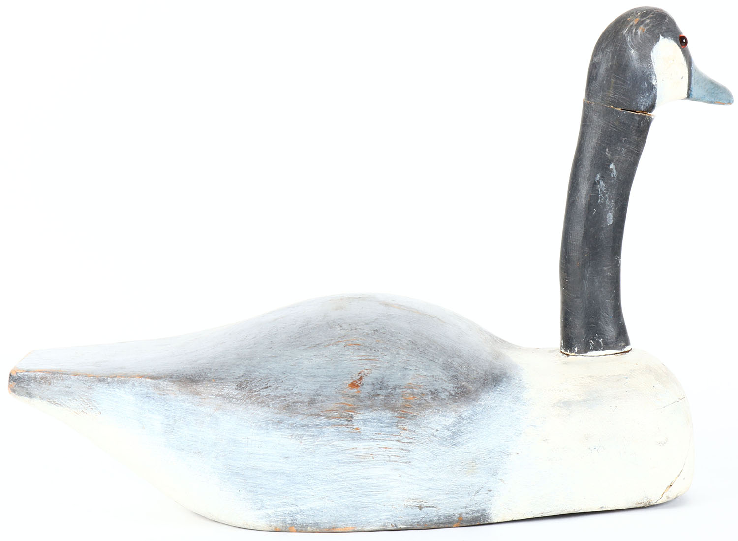 Canada Goose by unknown maker, glass eyes, solid wood, old hunter repaint, has age cracks on bottom and under neck. Grade: Very Good + - Value: 20 to 40