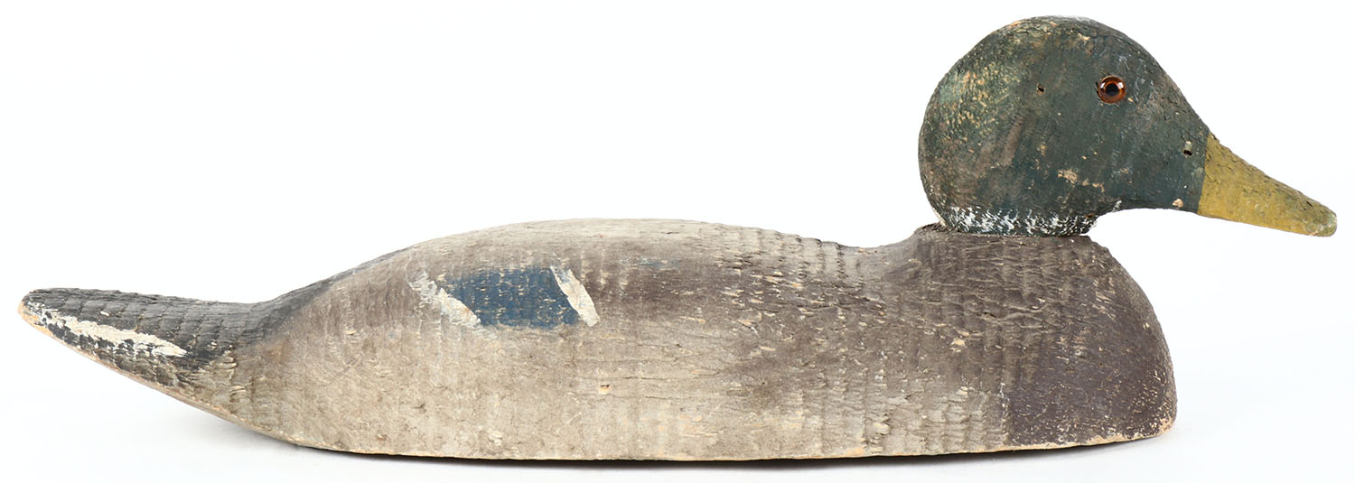 Mallard Drake by a Pascagoula, MS factory, glass eyes, one eye is missing, solid wood, original paint. Grade: Very Good + - Value: 20 to 40