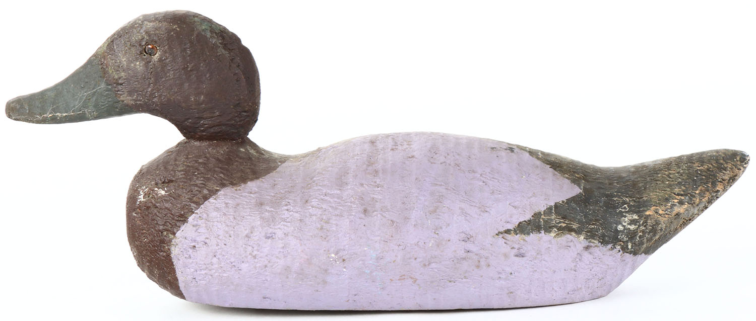 Canvasback drake by unknown factory, glass eyes, one eye is missing, old hunter repaint, has age cracks on bottom and on bill. Grade: Very Good - Value: 10 to 20