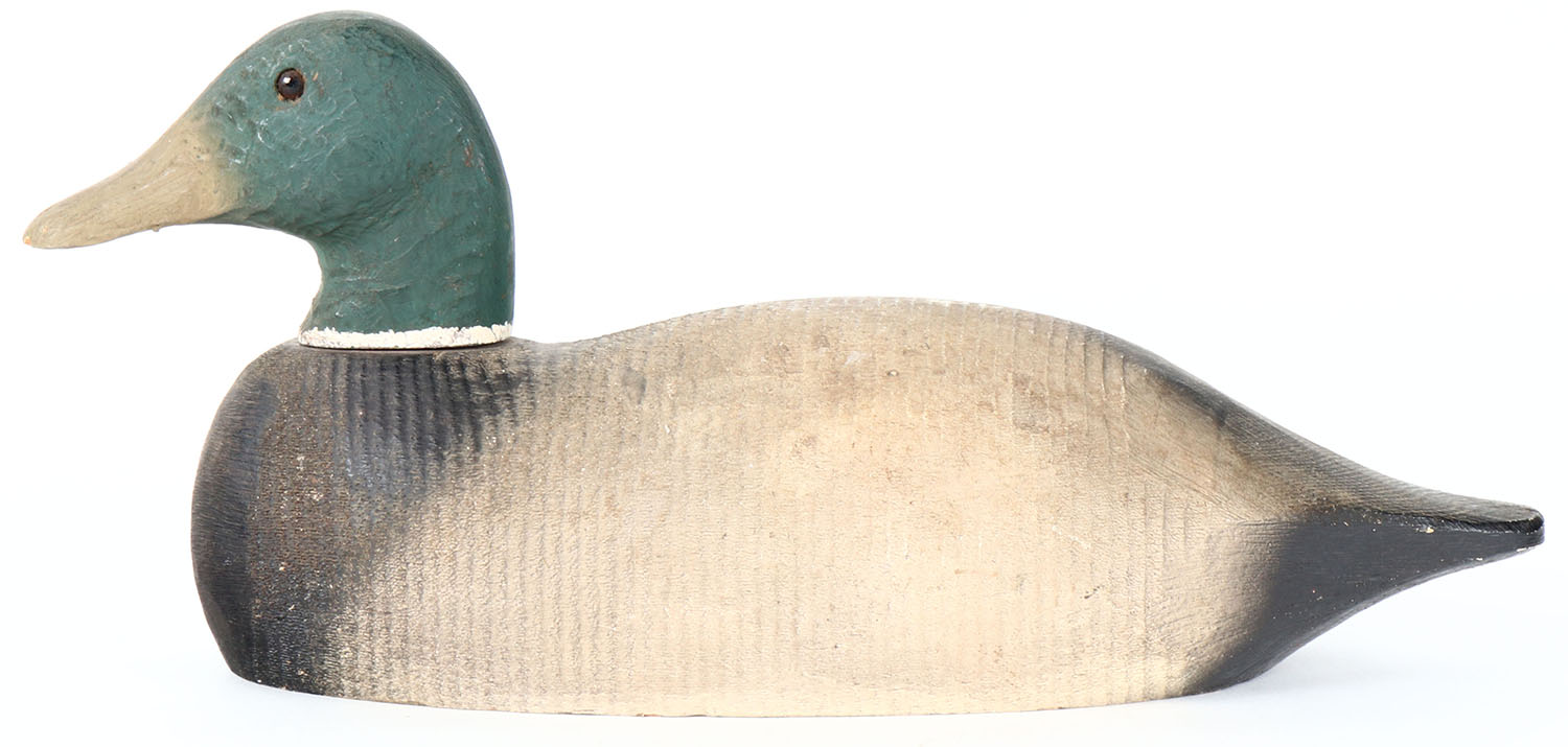 Mallard Drake by a combination of factories, Herters head on another factory lathe carved body, glass eyes, hollow wood, original paint, head is loose. Grade: Very Good - Value: 10 to 20