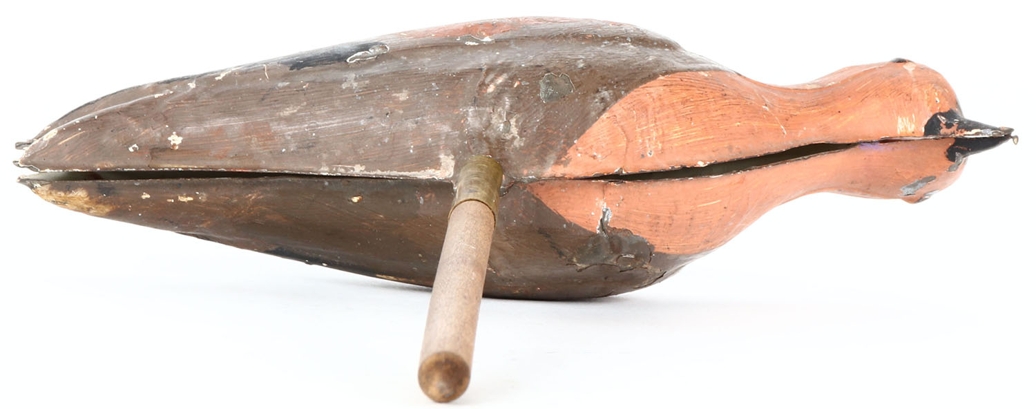 Metal 2pc Plover commonly referred to as Tinnies, Shorebird likely by WM. Read and Sons, competitor of Strater & Sohier, Boston MA, painted eyes, with wire hinges, original paint, 10'' OAL. Grade: Excellent - Value: 50 to 150