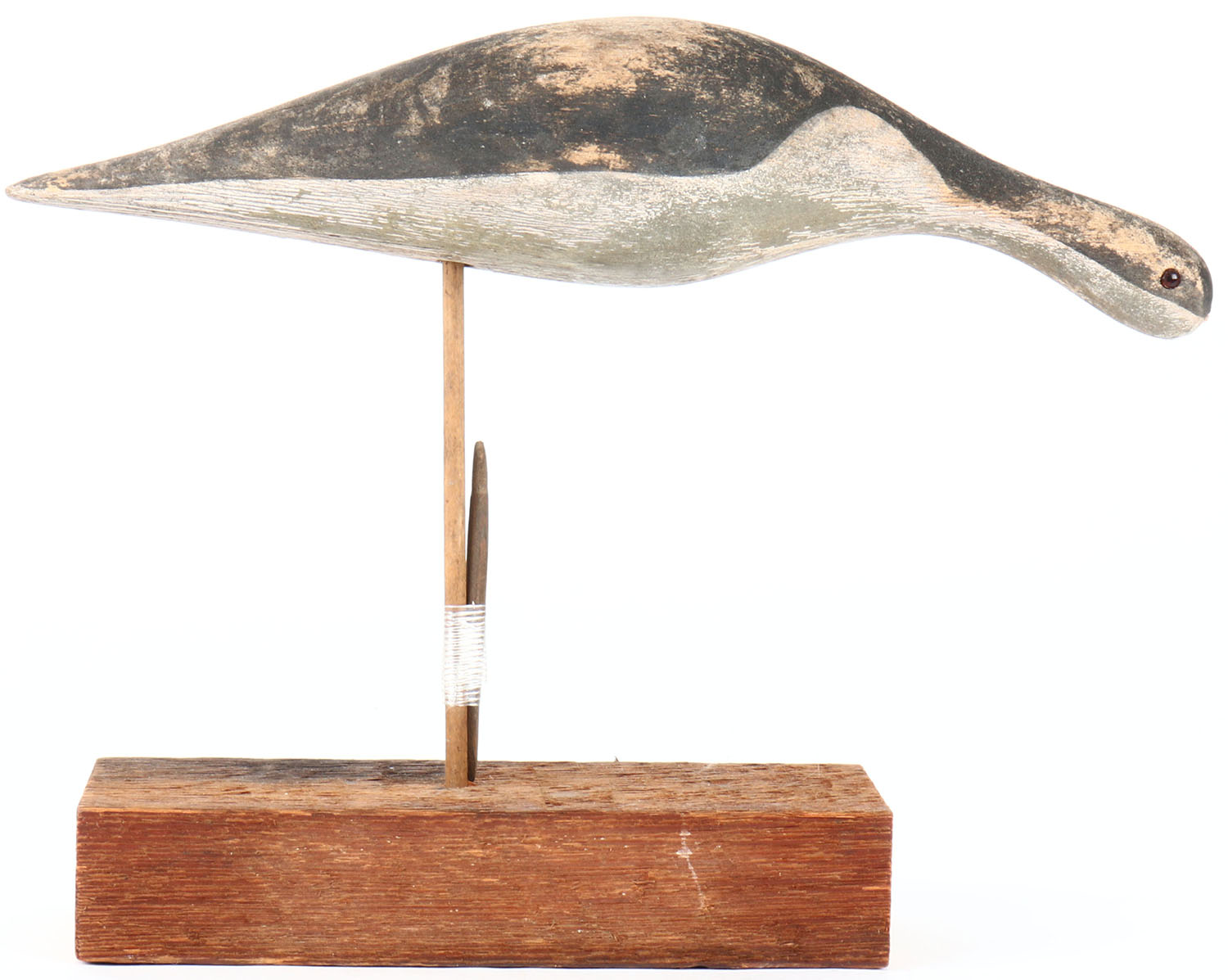 Shorebird by unknown maker, glass eyes, solid wood on wood stand, original paint, bill is attached to the stand. Grade: Very Good - Value: 40 to 80