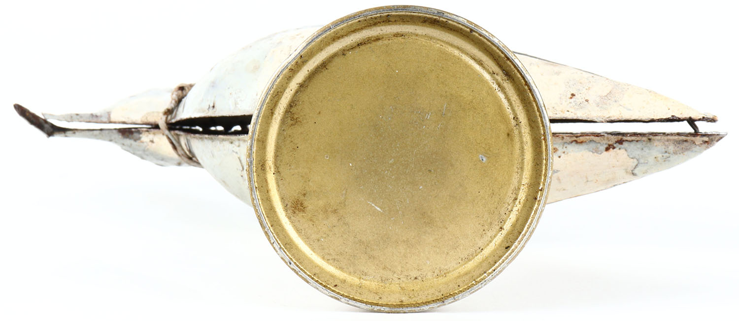 Metal 2pc Shorebird commonly referred to as Tinnies, Shorebird likely by WM. Read and Sons, competitor of Strater & Sohier, Boston MA, painted eyes, with wire hinges, original paint, 10'' OAL. Grade: Excellent - Value: 50 to 150