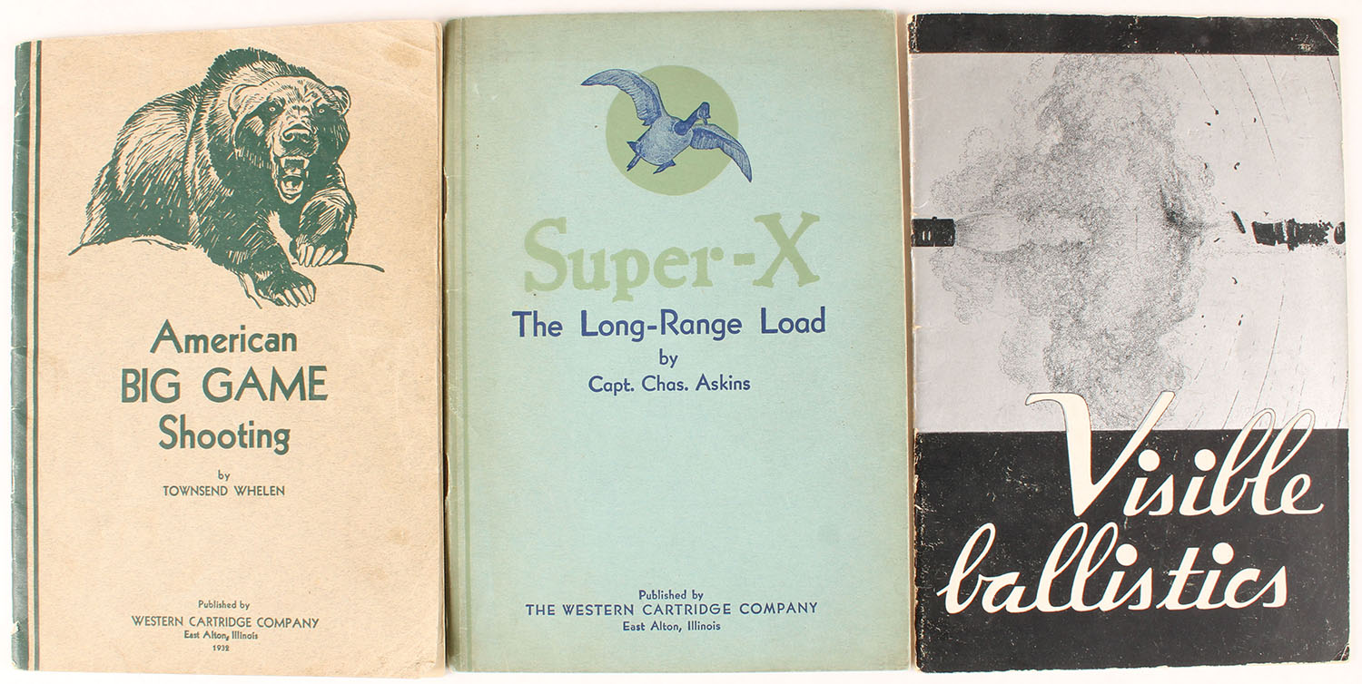 Lot of 3 (1) Super-X The Long-Range Load by Capt. Chas. Adkins (1) Visible Ballistics by The Peters Cartridge Company (1) American Big Game Shooting by Townsend Whelen 1939, all 5 1/2'' x 8''. Staplebound, papercover very good. Grade: Excellent - Value: 2 to 50