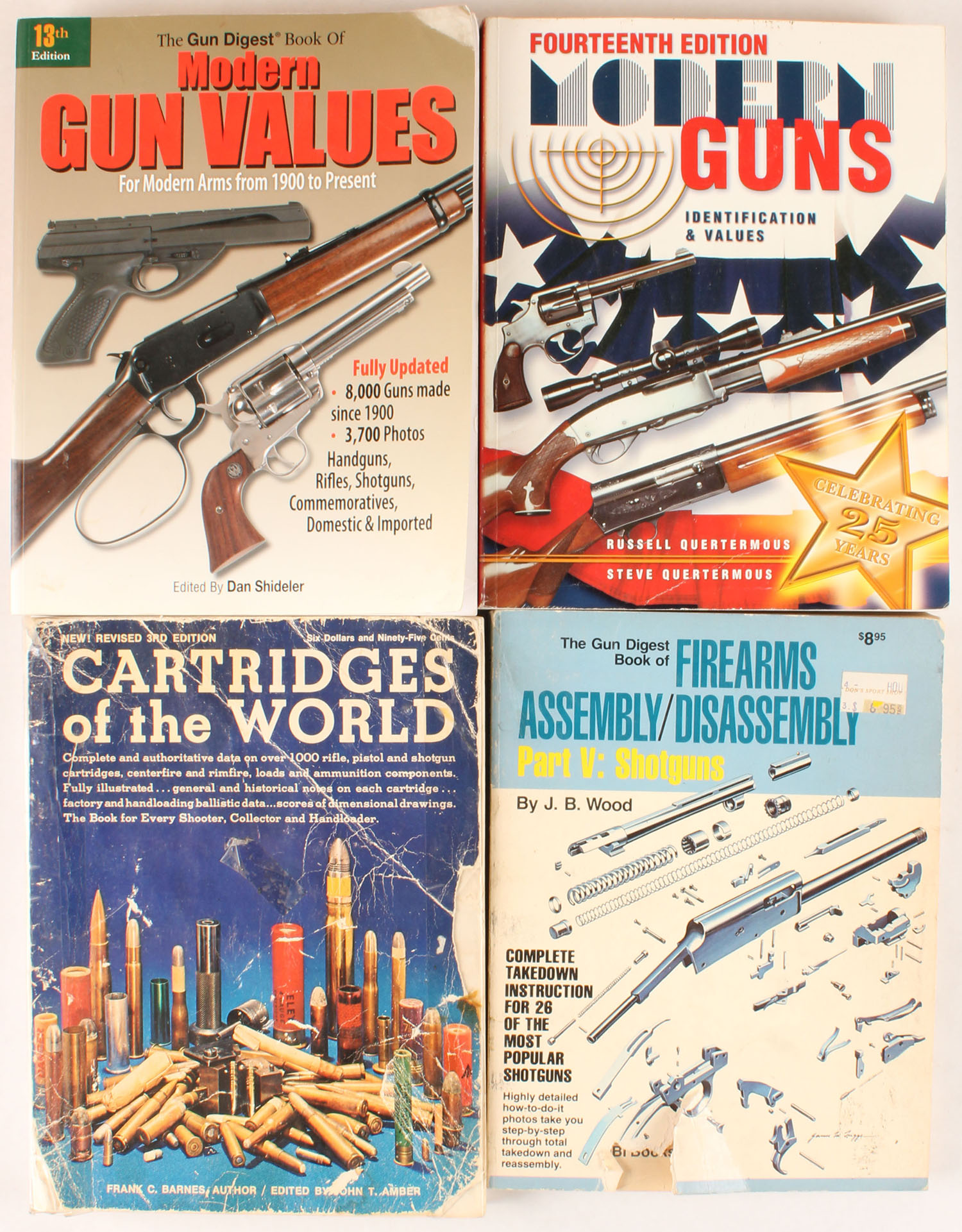 Lot of 4 (1) 13th Edition Modern Gun Values by Dan Shideler, 8 1/2'' x 11''. (1) Modern Guns: Identifications & Values Fourteenth Edition, 8 1/2'' x 11''. (1) Revised 3rd Edition Cartridges of the World by Frank C. Barnes, 8 1/2'' x 11''. (1) The Gun Digest Book of Firearms Assembly/Disassembly Part B: Shotguns by J. B. Wood, 8'' x 10 1/2''. Grade: Very Good ++ - Value: 6 to 60