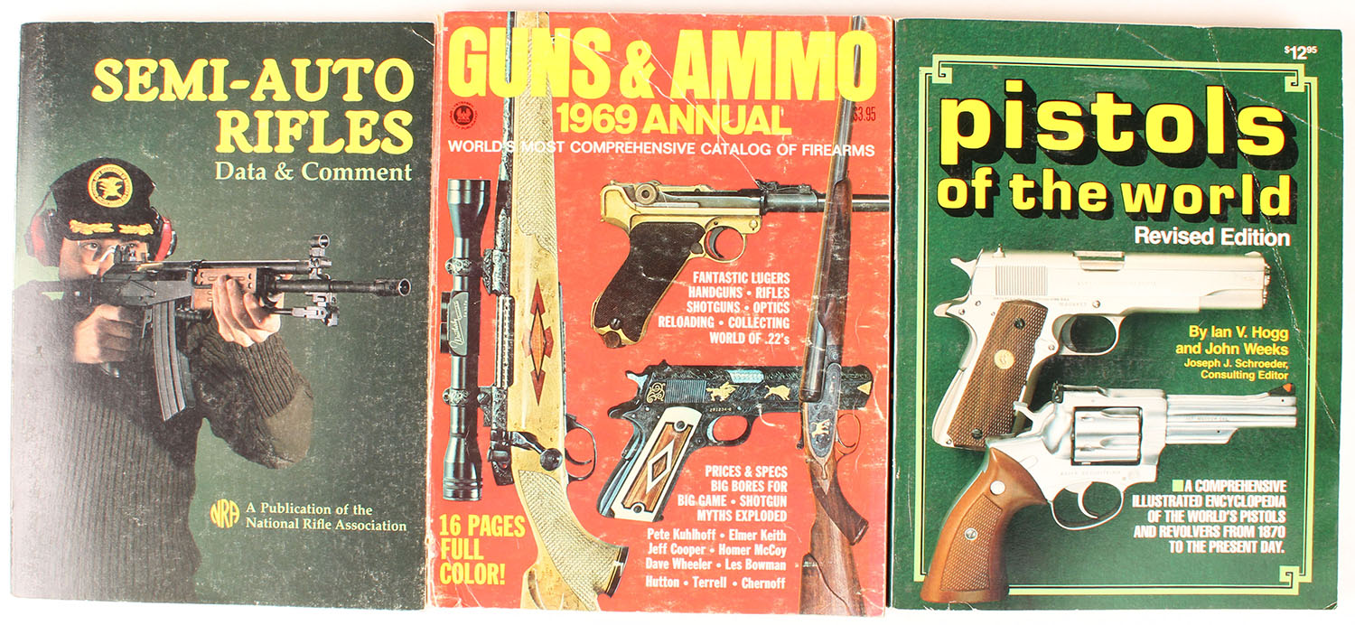 Lot of 3 (1) Pistols of the World Revised Edition by Ian V. Hogg and John Weeks, 8'' x 10 1/2''. 306 pages. (1) Guns & Ammo 1969 Annual: Worlds Most Comprehensive Catalog Of Firearms 1968 by The Editors Of Guns & Ammo, 8'' x 10 1/2''. 368 pages. (1) Semi-Auto Rifles: Data & Comment by Robert W. Hunnicutt 1988, 7 1/2'' x 10 1/2''. 156 pages. Grade: Very Good ++ - Value: 2 to 60