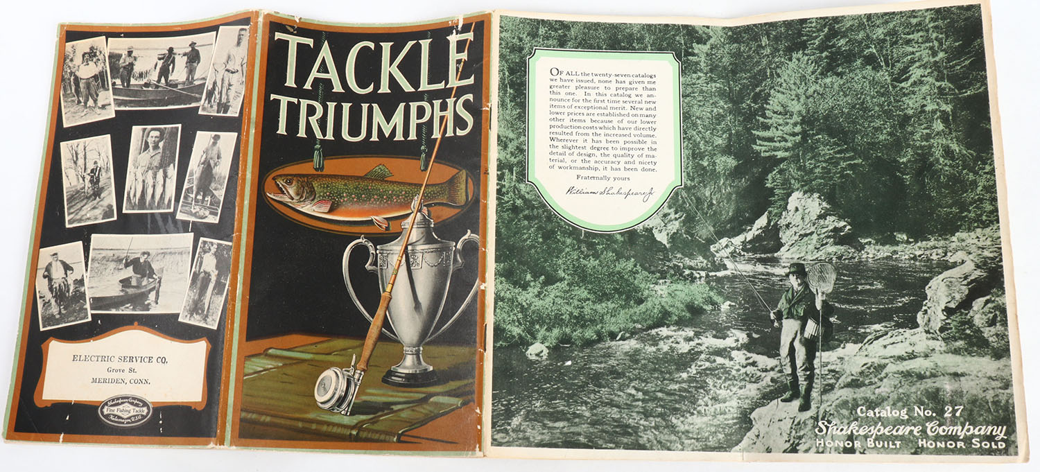1927 Shakespeare Fishing Catalog, TACKLE TRIUMPHS, great image of brook trout fly rod & reel with trophy on cover, full line of gear inside are pictured, 48 pages, 4 1/2'' x 8''. Grade: Excellent - Value: 30 to 150