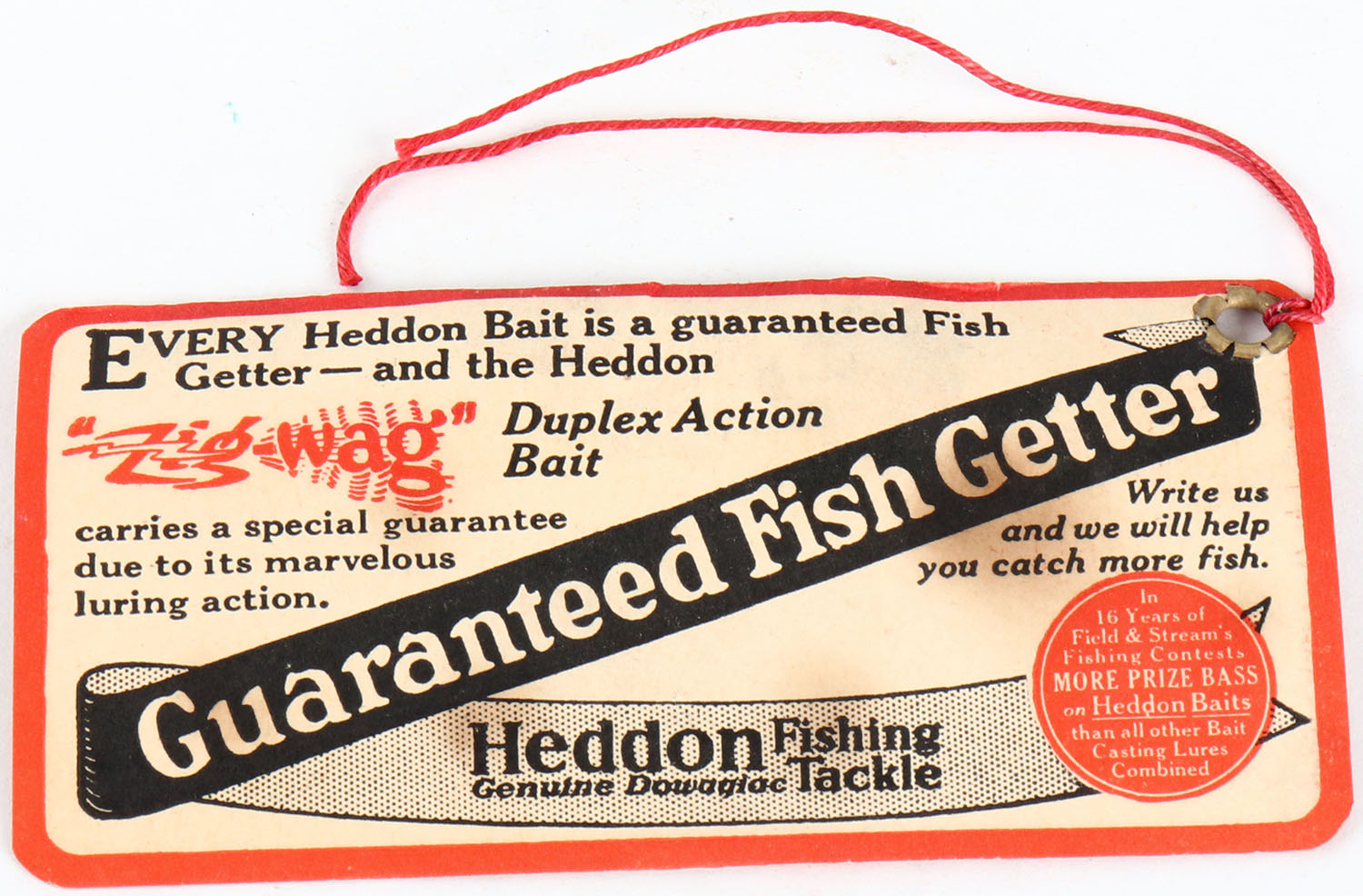 RARE Early Heddon ZIG-WAG wood lure in orginal DOWN Box! Red & white, GE, shows light crazing & small chips to lip otherwise nice, box has nice color, has orginal hang tag with images on both sides. Grade: Excellent - Value: 40 to 200