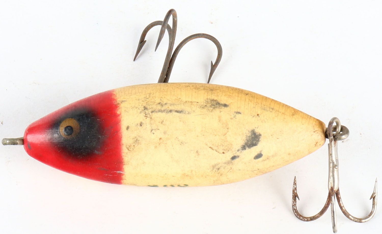 | Heddon SOS Minnow, wood lure, PE, red & white, 2 hooks, marked ...
