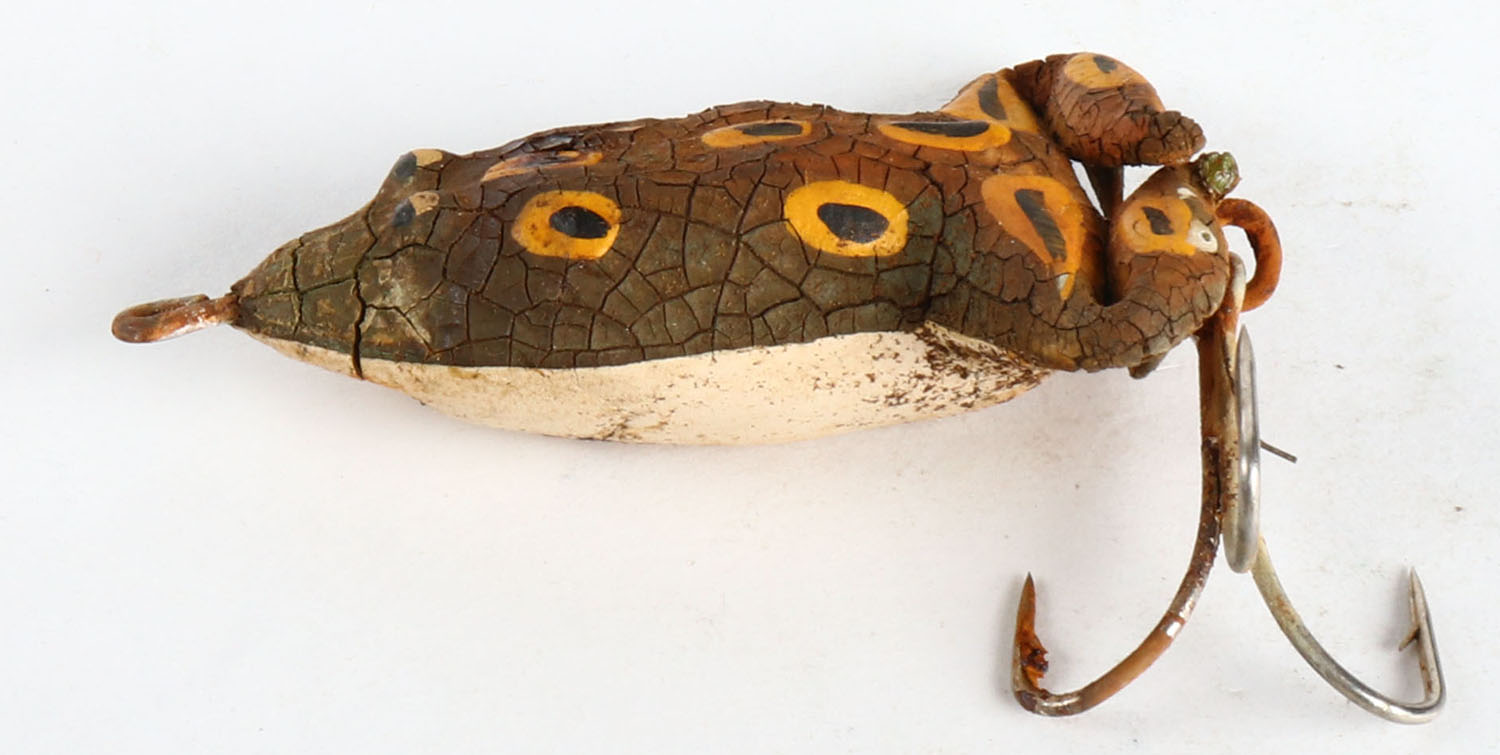 Pflueger? Conrad Frog, rubber lure, raised eyes, frog pattern, 1 hook, 2 3/4'', shows crazing. Grade: Very Good - Value: 10 to 60