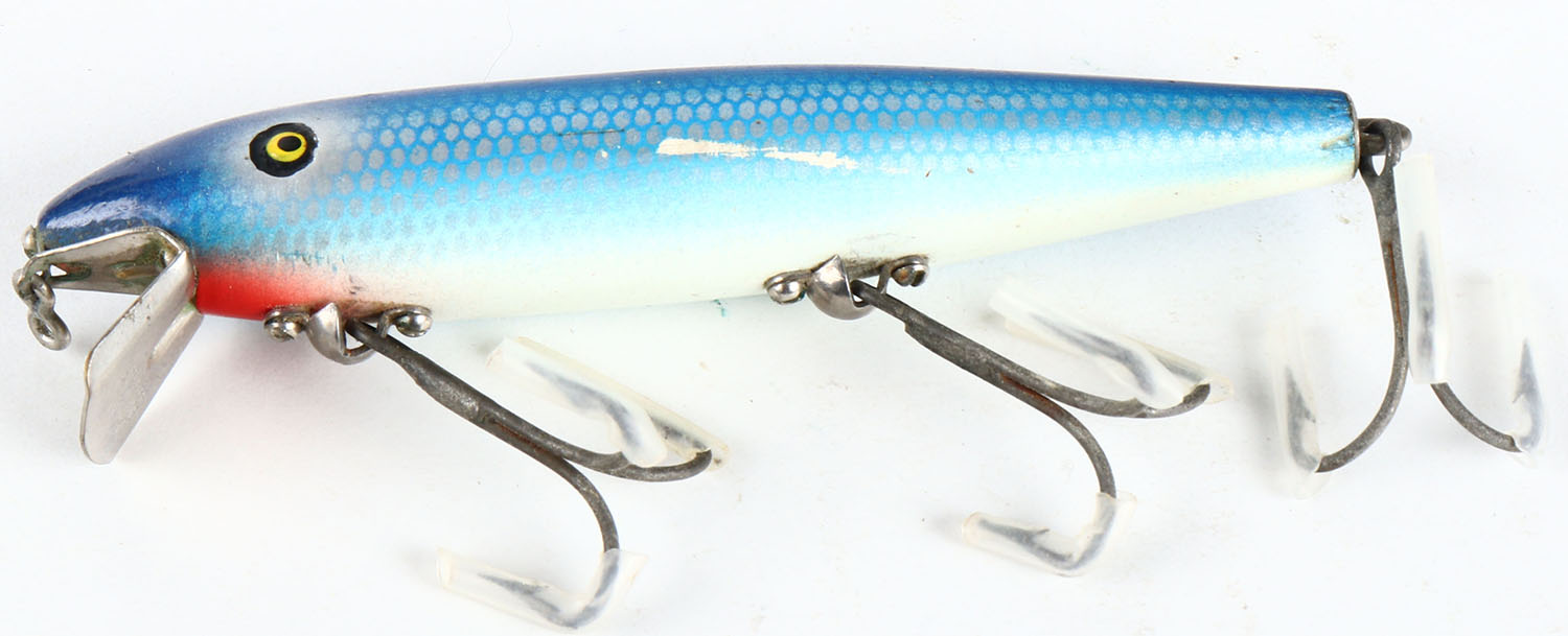 Pflueger Palomine, wood lure, PE, blue & white scale, 3 hooks, marked metal lip, surface rig, 4 1/2'', shows one small scuff mark. Grade: Excellent + - Value: 10 to 40