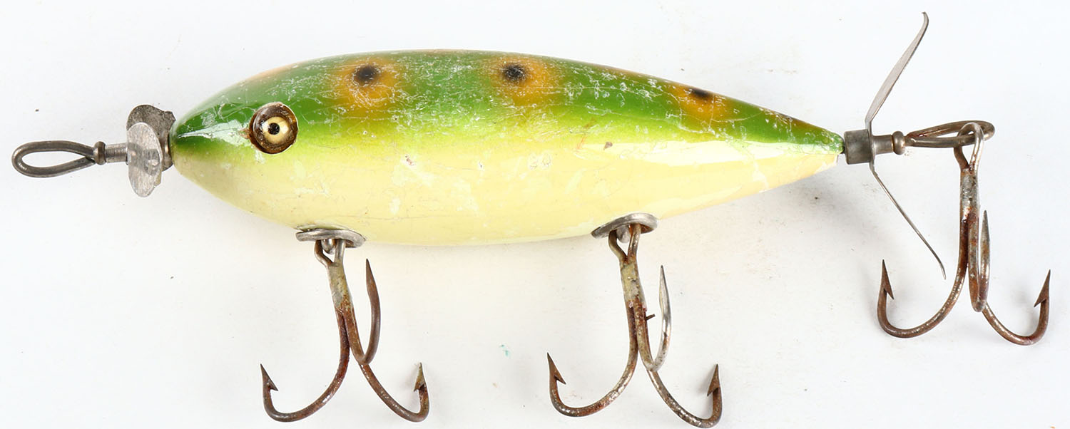 South Bend Surf Oreno, GE, frog pattern finish with some scuffing to back, still a nice wood lure, 3 hooks. Grade: Very Good ++ - Value: 30 to 90