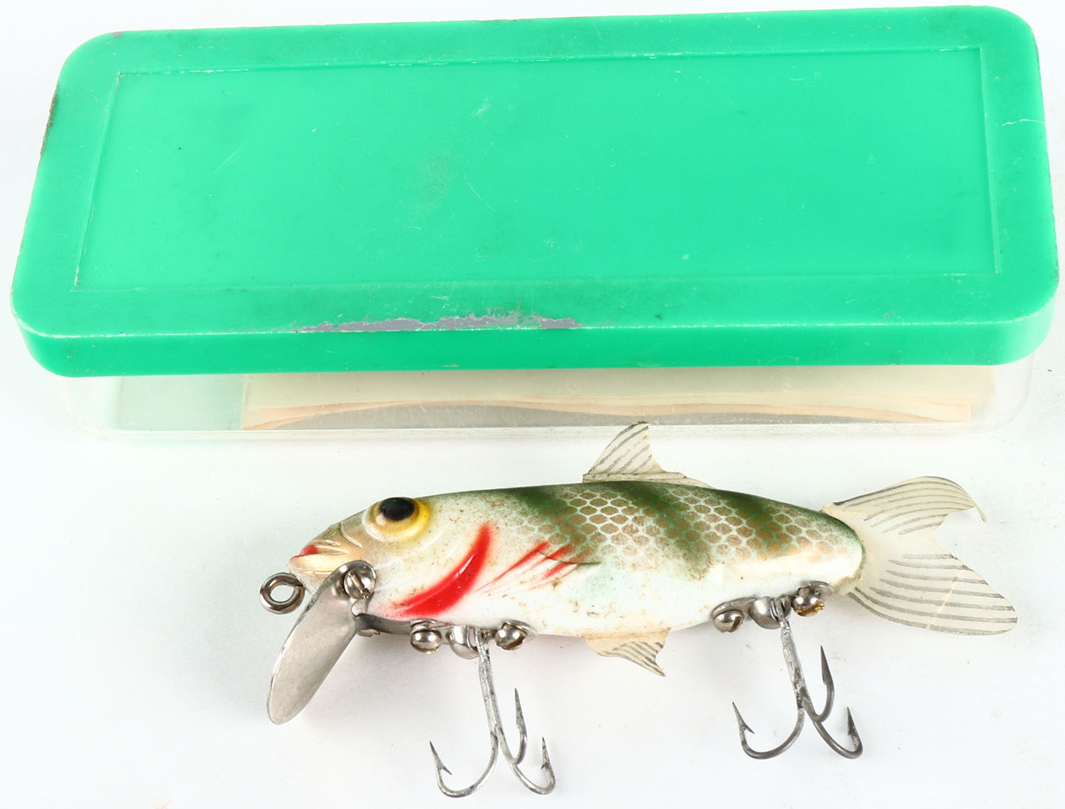 Natural lure bait co., Strikie Minnow lure in the original box, green & white scale, PE, metal lip, 2 hooks. Grade: Excellent - Value: 2 to 20