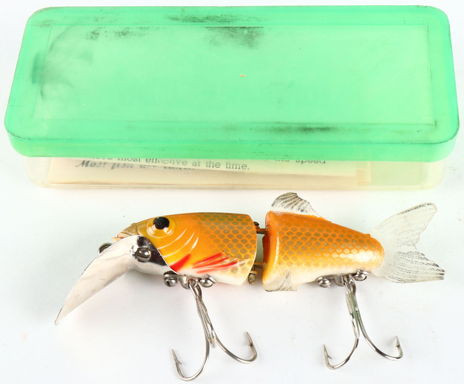 Natural lure bait co., Jointed Strikie Minnow lure in the original box, green scale, PE, metal lip, 2 hooks. Grade: Excellent - Value: 2 to 20