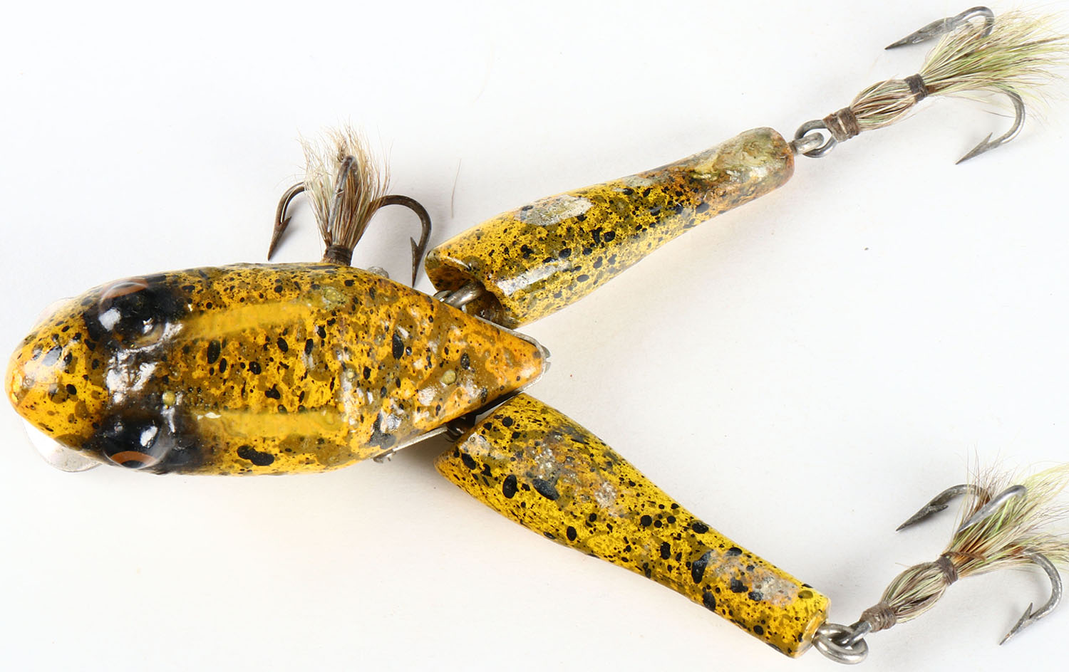Paw Paw Frog lure, yellow pattern has hair skirts on all three hooks. Grade: Excellent ++ - Value: 20 to 80