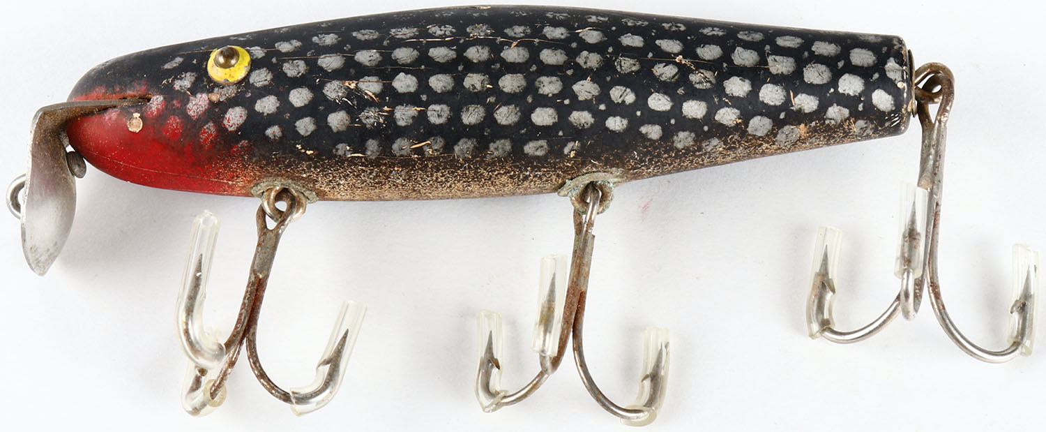 Unmarked wood lure, black with silver spots, TE, 3 hooks, 4 3/4''. Grade: Very Good ++ - Value: 6 to 30