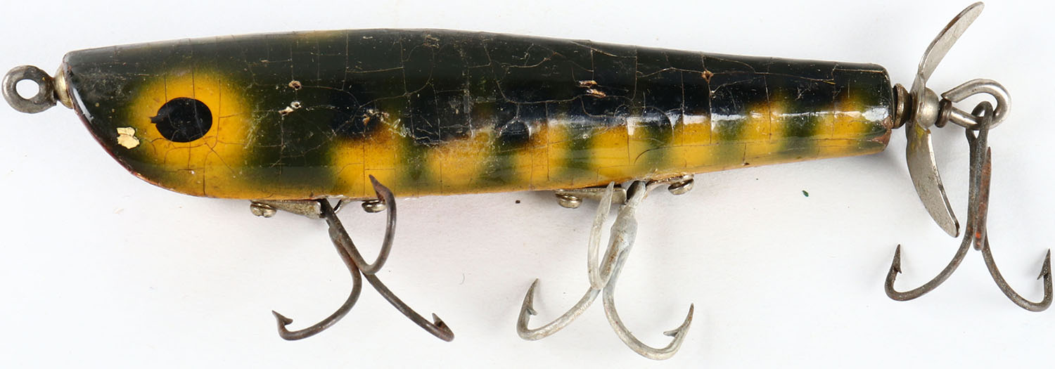| Dalton Special wood lure, frog pattern, PE, 3 hooks, marked on b...