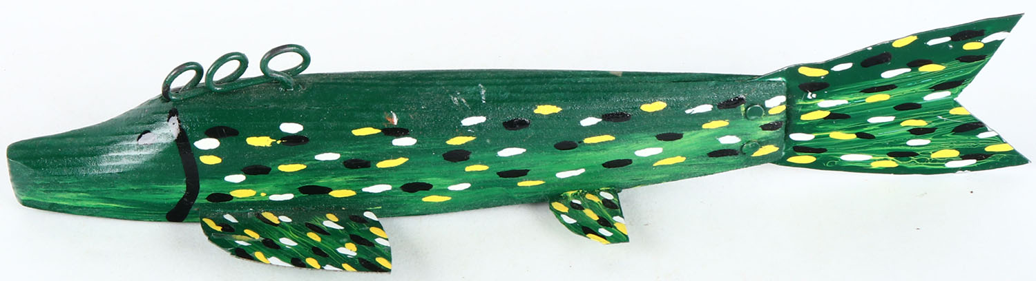 GA marked Ice Fishing Decoy, PE, 3 line ties, has 5 metal fins, 6 1/2'' OAL. Grade: Excellent ++ - Value: 10 to 100
