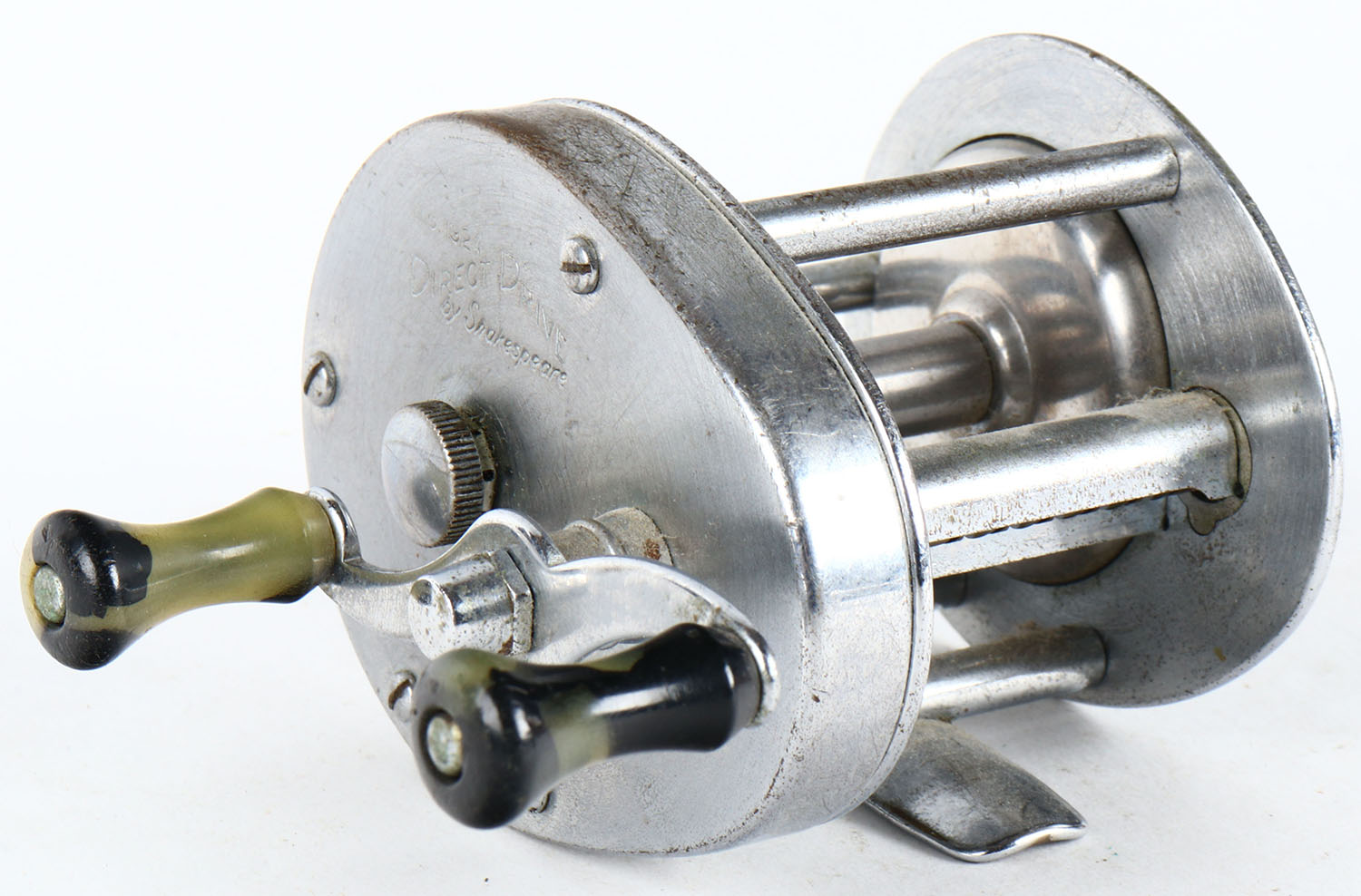 Shakespeare Direct Drive, Level wind reel, No. 1924, Model FK, dual handle, strong click & spins well. Grade: Excellent - Value: 6 to 30