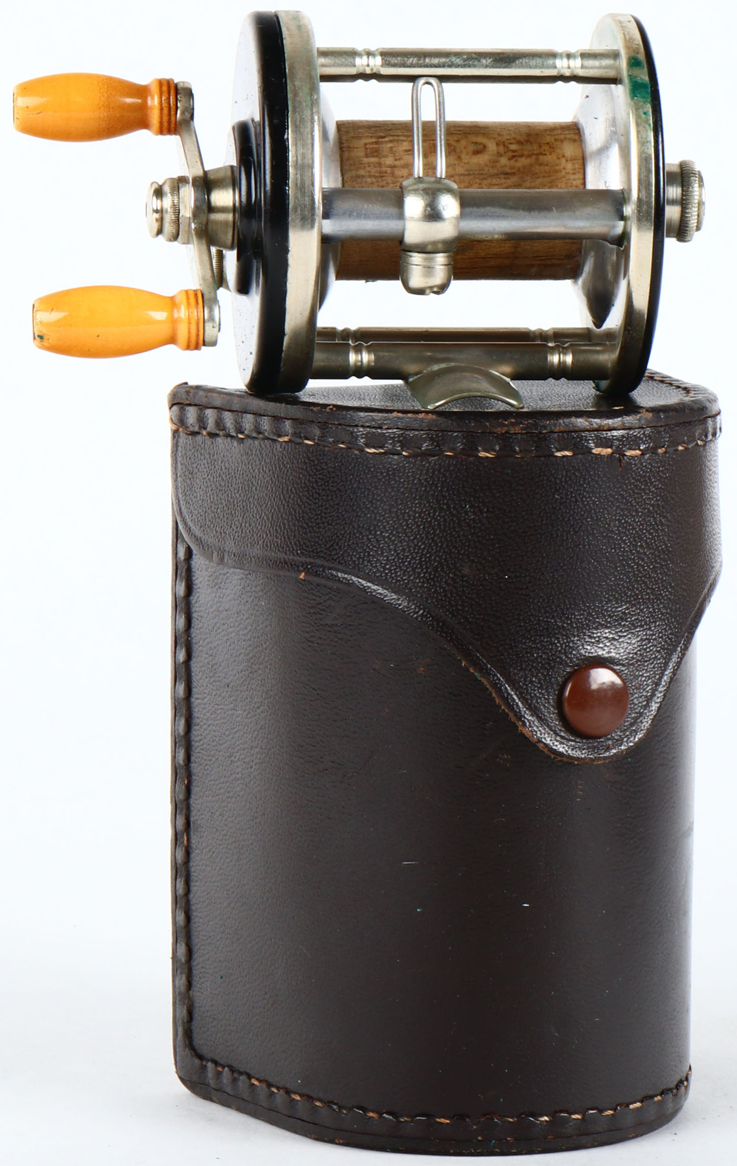 A.J. Coxe Reel Co., Model No. 25-3, level wind reel, dual handle strong click, works great, has leather box. Grade: Excellent - Value: 10 to 60
