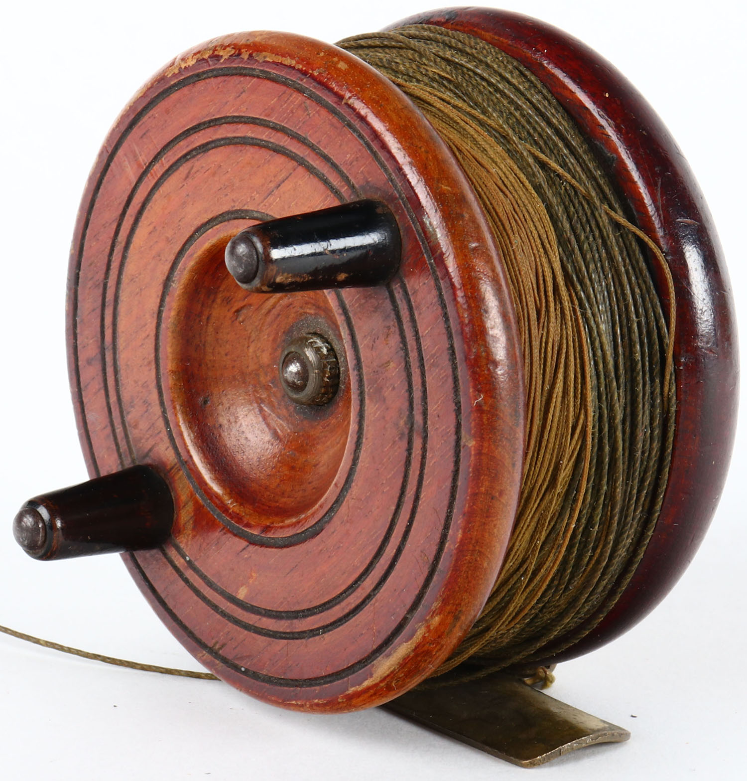 | Wood & Brass reel, dual handle, 3'' dia. Grade: Excellent -...