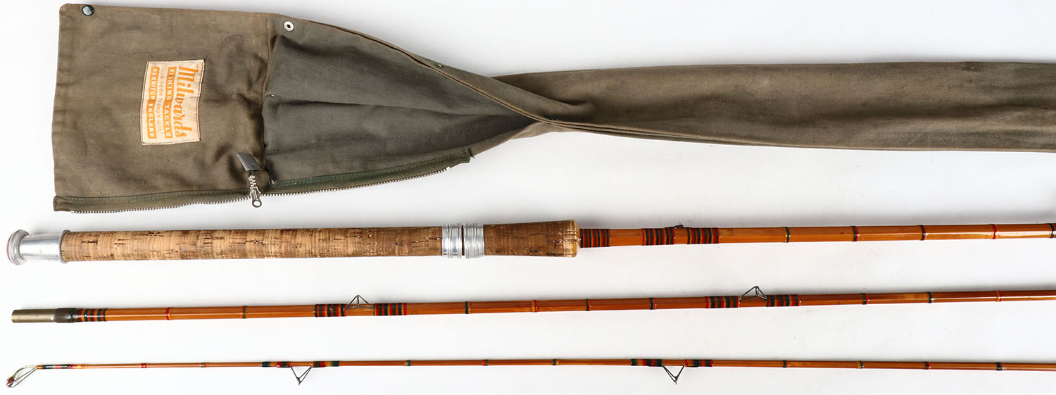 Milward's cane fishing rod, Redditch England, 10' 6'', 3/1, wraps are very colorful, cork handle is very nice, has marked canvas bag. Grade: Excellent - Value: 50 to 400