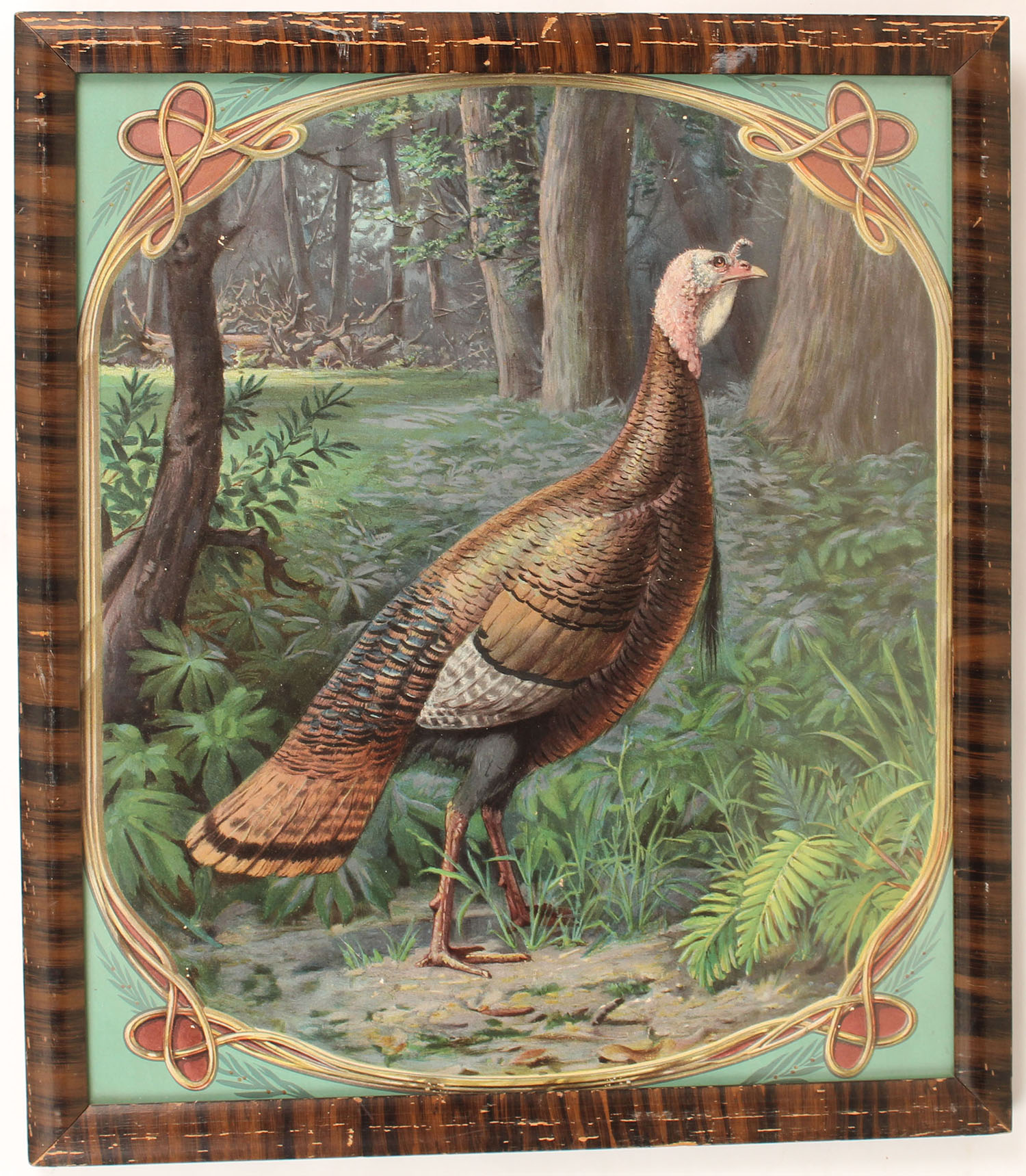 Winchester COCK OF THE WOODS Poster, Trimmed, has very nice image of wild turkey in the woods, shows some scuffing & light fading, trimmed to 15'' x 17 1/2'', framed. Grade: Very Good ++ - Value: 100 to 500