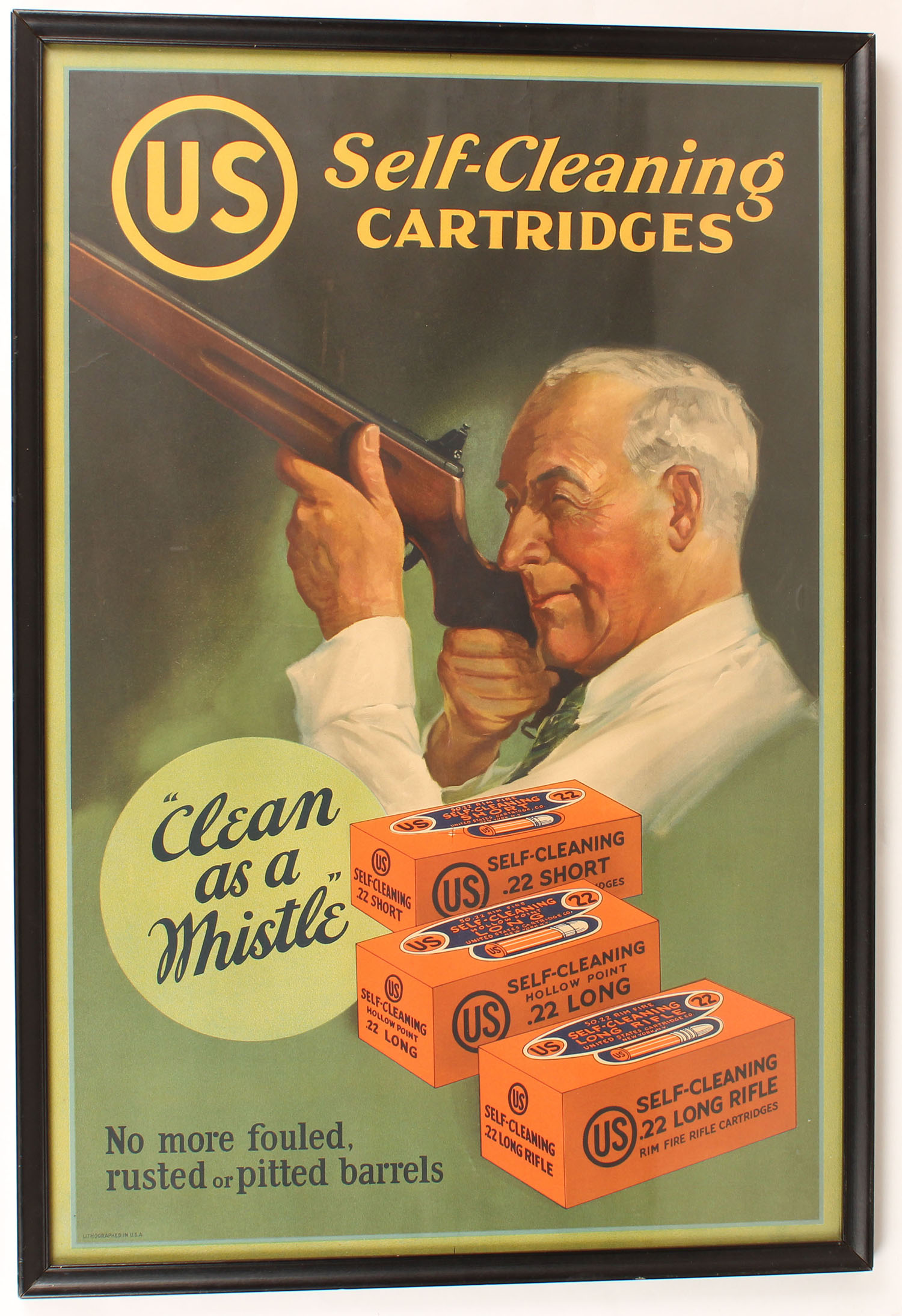 U.S. Cartridge Co. ''Self-Cleaning Cartridges'' Poster, pictures old man looking at .22 Rifle with .22 boxes, no bands, has no edge wear with fantastic colors, framed Grade: Excellent ++ - Value: 500 to 2000