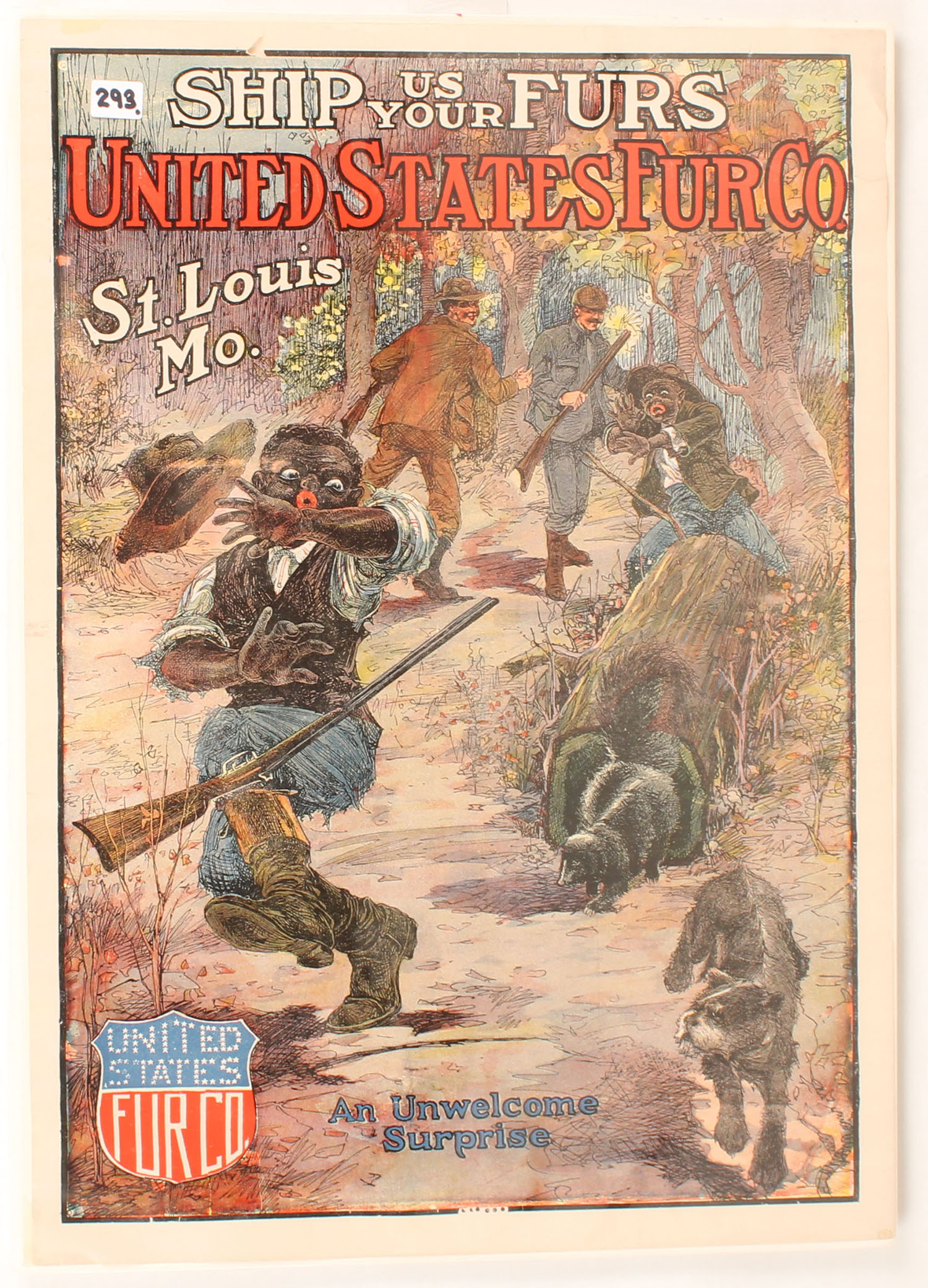 United States Fur Co. Poster, St Louis MO, ''SHIP US YOUR FURS'', An Unwelcome Suprise is the title, pictures a hunter being surprised by a skunk in a log, 15 1/4'' x 21 1/4'' - Value: 50 to 200