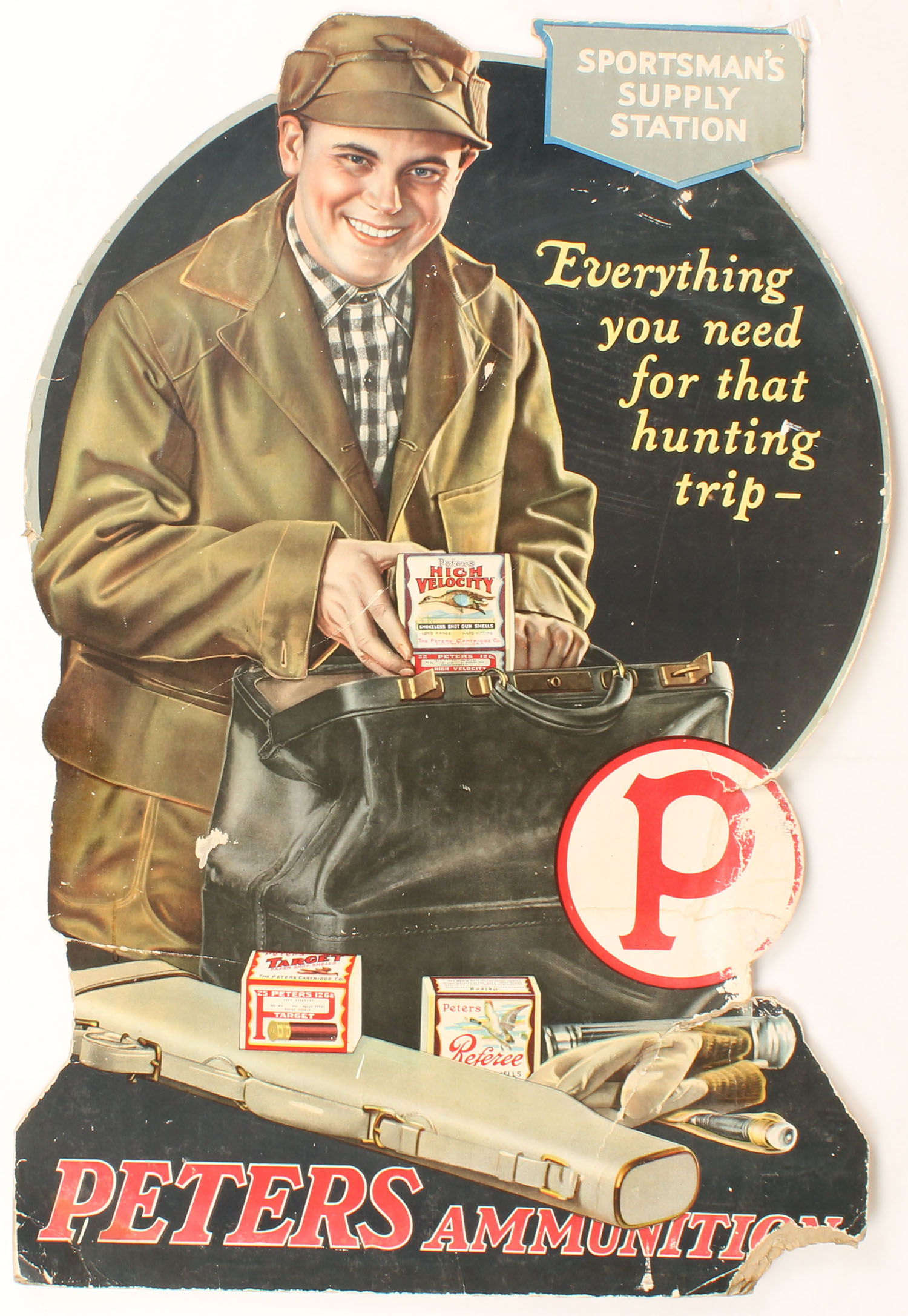 Peters Diecut pictures hunter holding three 2pc shotshell boxes, ''SPORTSMANS SUPPLY STATION, EVERYTHING YOU NEED TO THAT HUNTING TRIP'', shows tears & edge wear, 21'' x 31''. Grade: Very Good - Value: 100 to 500