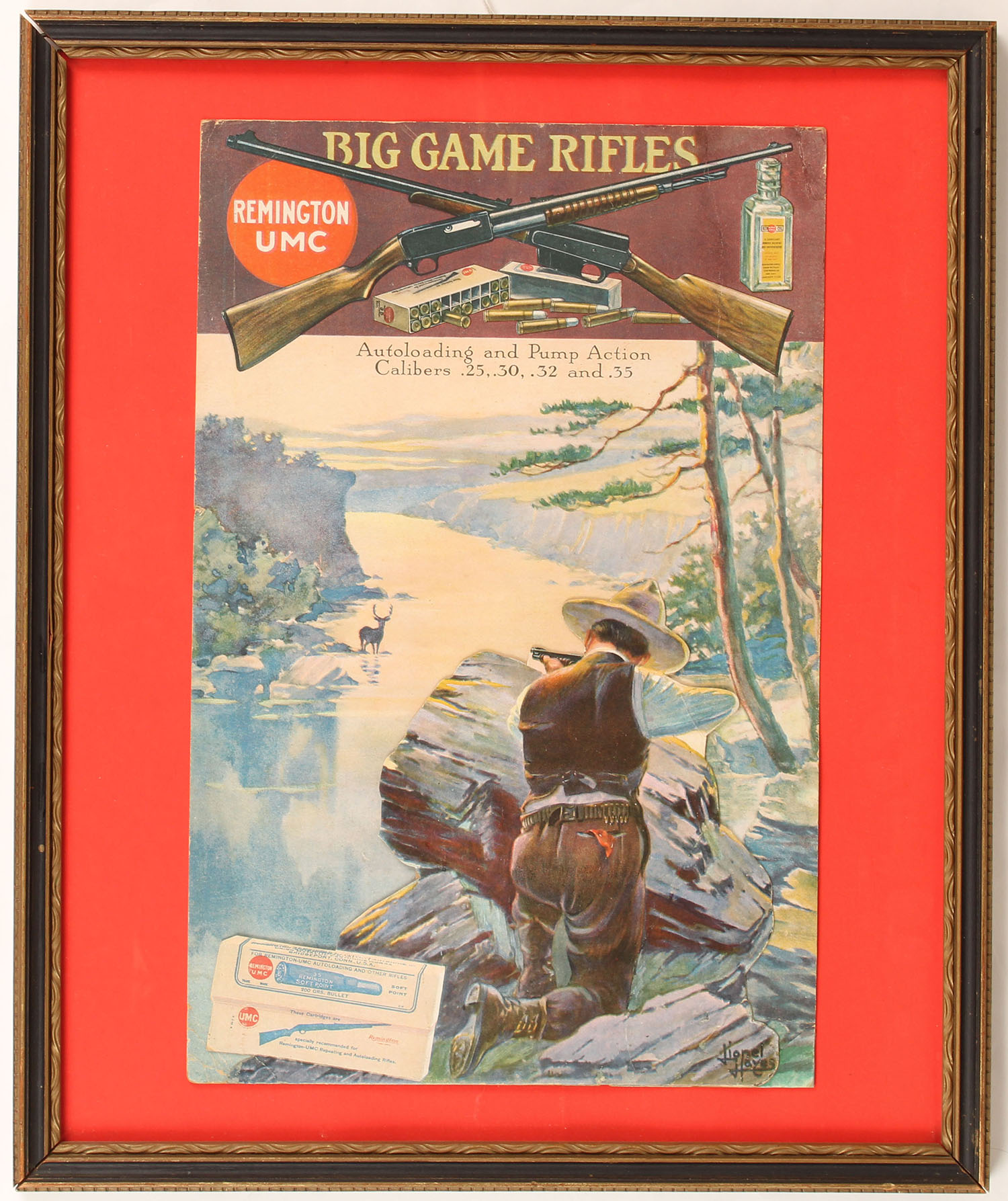 Remington UMC 3D Diecut pictures hunter shooting at a deer in a river, artist Honel Jlayes, pictures two crossed rifles & ammo at the tom & one 2pc box at the bottom, great graphics, has easel back, 9 3/4'' x 15'', great colors, framed. Grade: Excellent + - Value: 200 to 600