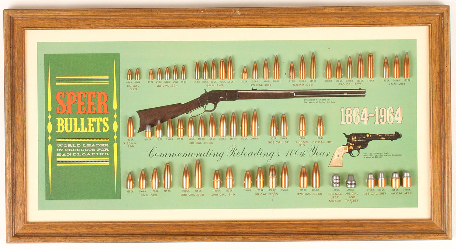 Speer Bullet Board, pictures Model 1873 Winchester & Colt SAA revolver, all bullets intact. Grade: Excellent + - Value: 70 to 250