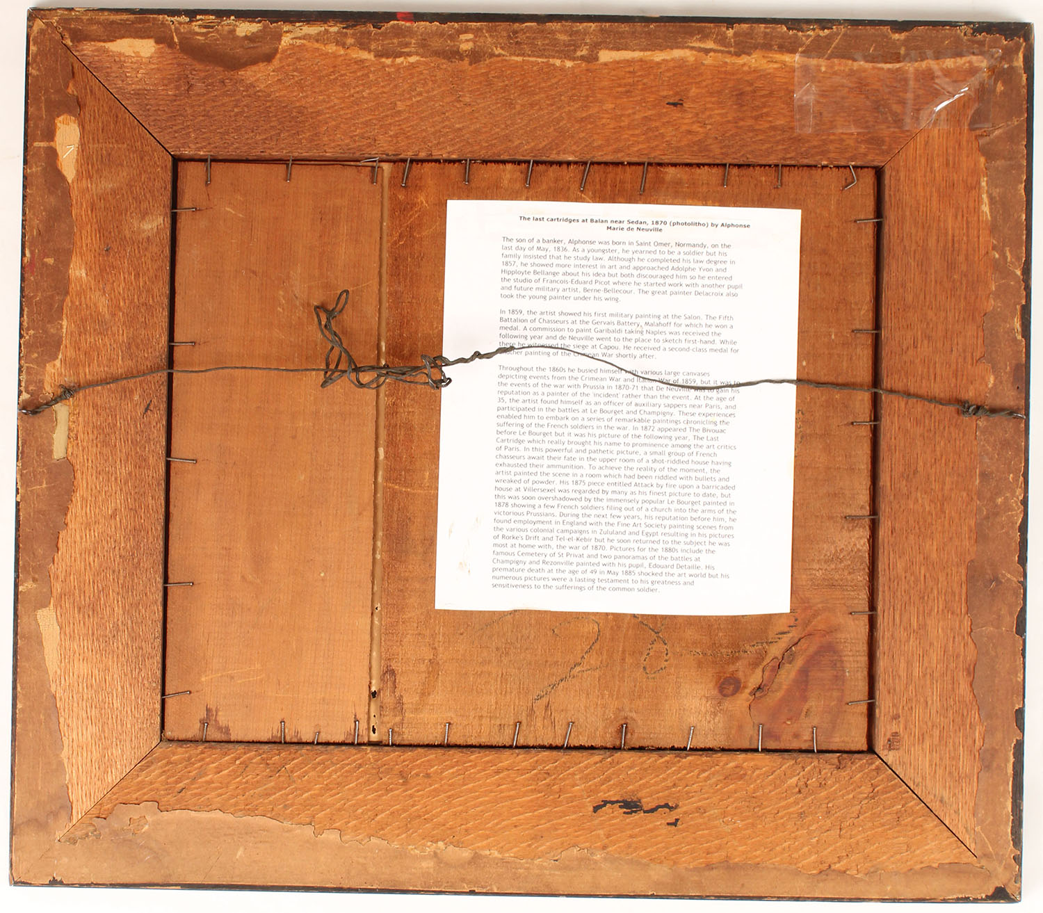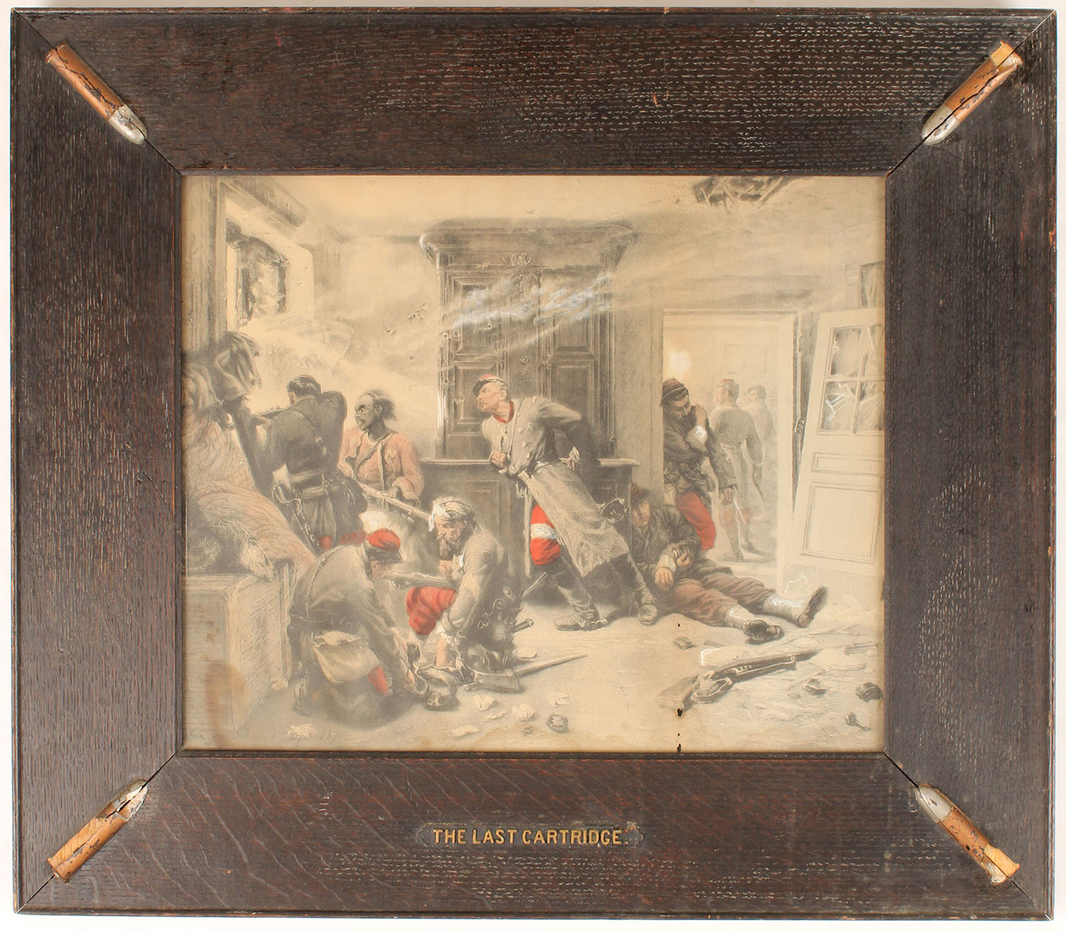 THE LAST CARTRIDGE by Alphonse Marie de Neuvill, (photolitho), image at Balan near Sudan, 1870, pictures a full color image of soldiers wounded inside a home fighting down the last cartridge, the frame has raised cartridges in corners, some show chipping, image shows a stain to bottom left. Grade: Very Good + - Value: 40 to 250