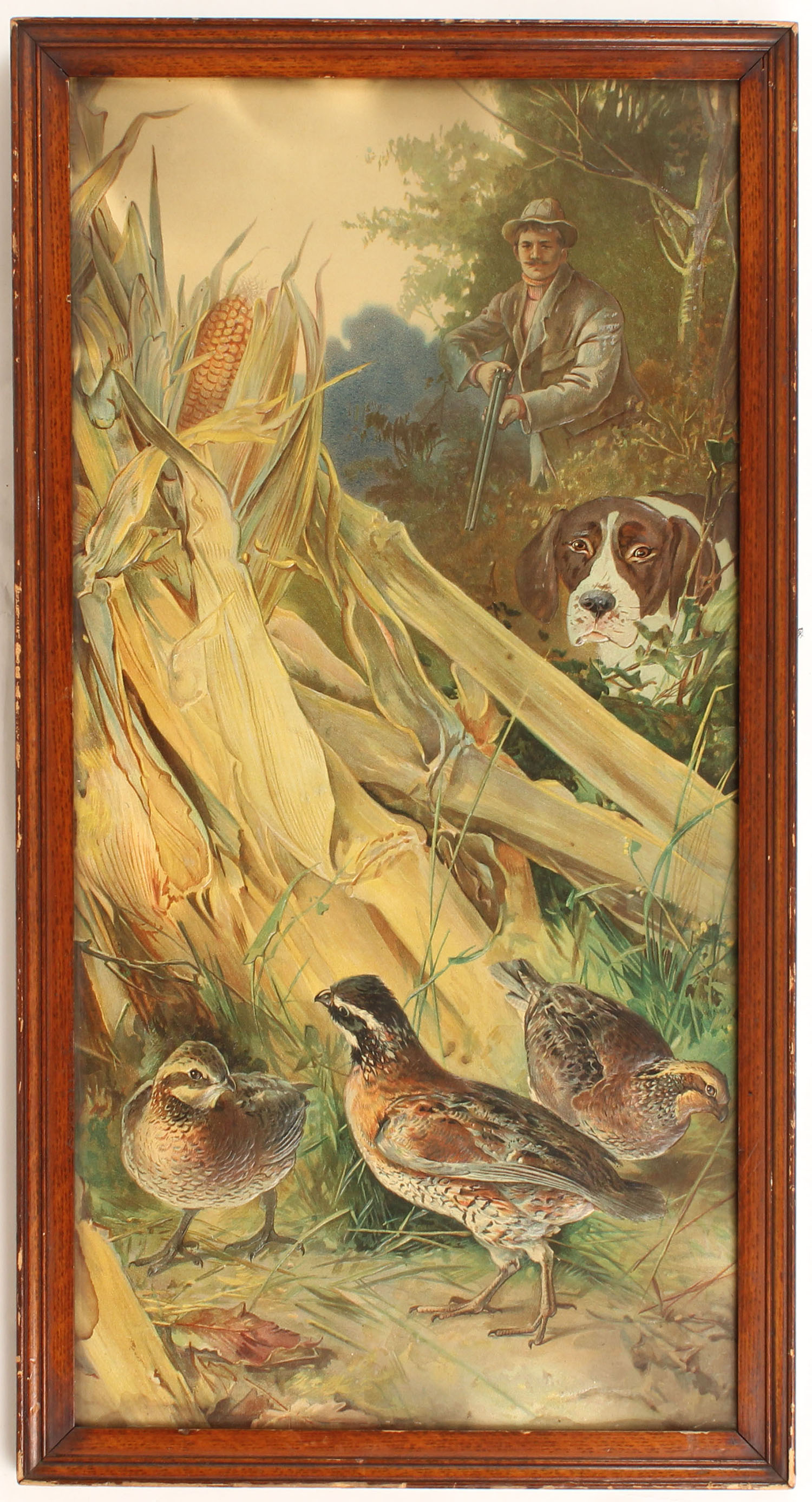 Embossed print of hunter with double shotgun & dog on point with covey of quail in corn, nice colors with stain to bottom left, 11'' x 22 1/2'', famed. Grade: Very Good ++ - Value: 50 to 250