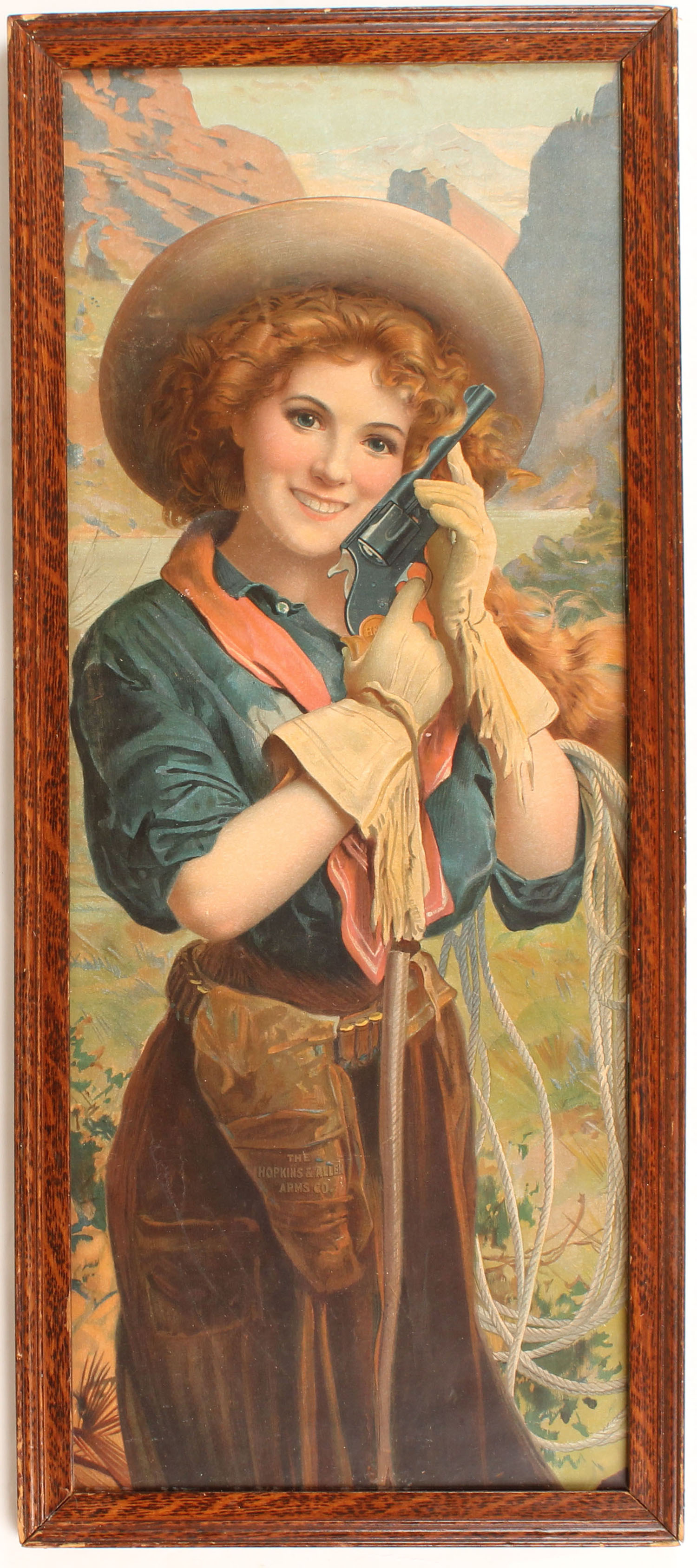 RARE HOPKINS & ALLEN ARMS CO. poster has full color image of lady holding her revolver with a leather holster marked Hopkins & Allen Arms Co., dressed in full cowgirl attire, bright vivid colors, 10'' x 24 1/2'' image size, no bands, framed. Grade: Excellent - Value: 500 to 2000
