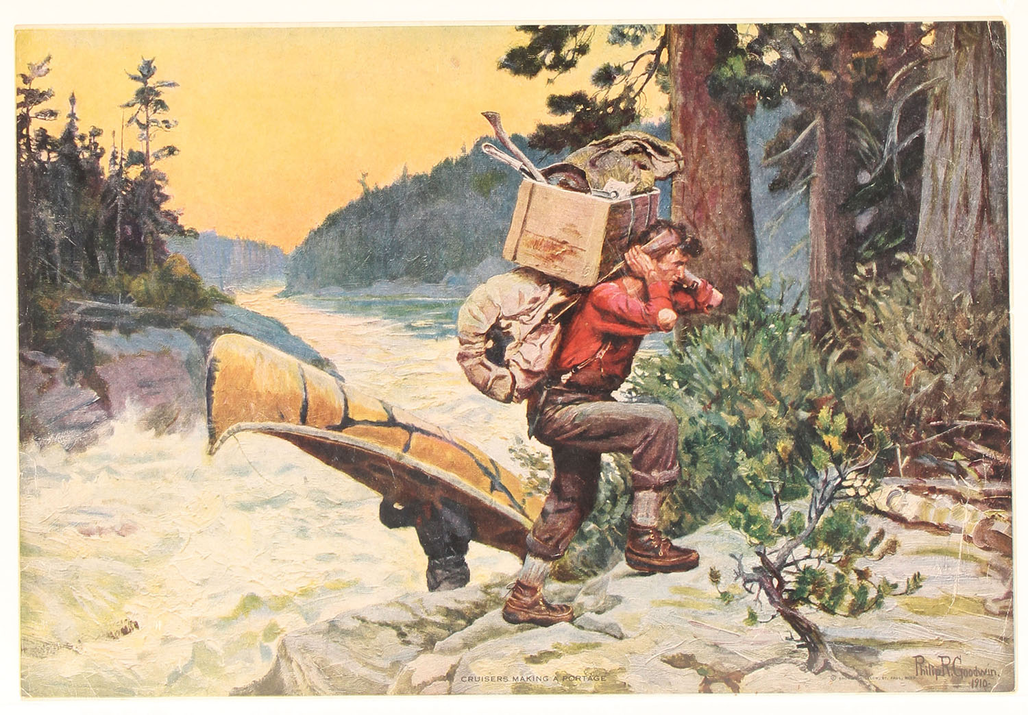 Philip R Goodwin print CRUISERS MAKING A PORTAGE, pictures full colored image of hunters packing all there gear & birch canoe around the rapids, 14'' x 9 1/2'' image size. Grade Excellent - Value: 50 to 200