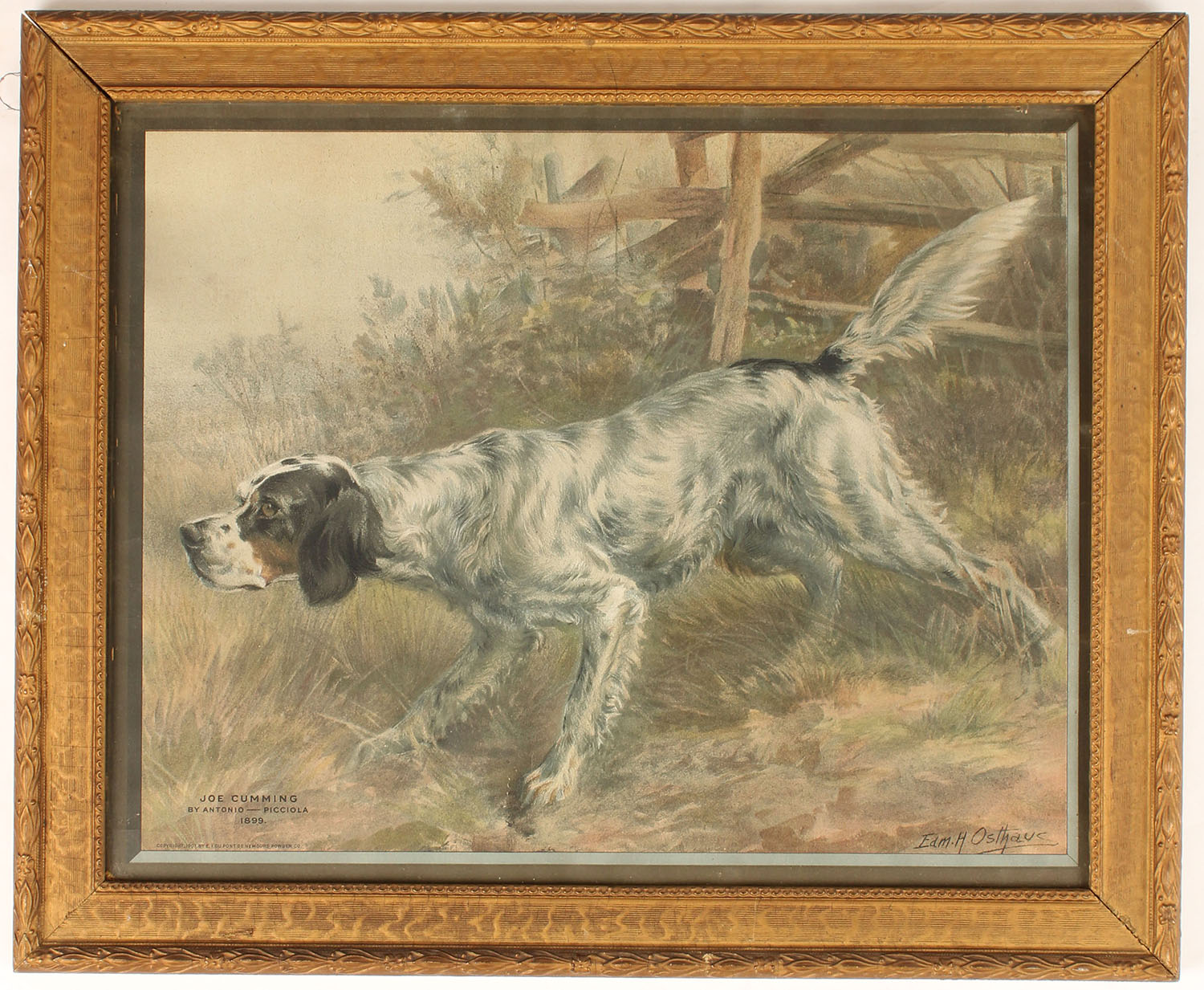 Edm H. Osthaus JOE CUMMING (by Antonio - Picciola 1899), pictures E.I. Du Pont hunting English Setter on point, 18 1/2'' x 14 1/2'' image size, framed, nice colors. Grade: Excellent - Value: 50 to 200